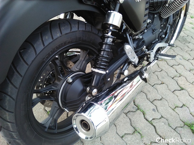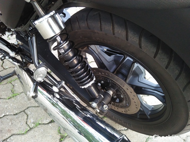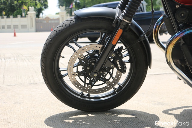 ระบบช่วงล่างโช้กแบบเทเลสโคปิก 40 มม. ระยะยืด 130 มม. สีดำพร้อมใส่ปลอกย่นกันฝุ่นให้ความคลาสสิกมากขึ้น ส่วนด้านหลังเป็น die cast light alloy swing arm คู่ปรับระดับความสูง-ต่ำได้ ขนาด 85 มม. ระยะยืด 111 มม. และเบรกหน้าดิสก์เดี่ยวคาลิปเปอร์จาก Brembo จานขนาด 320 มม. ด้านหลังเบรกเดี่ยวจานขนาด 260 มม. พร้อมระบบ ABS