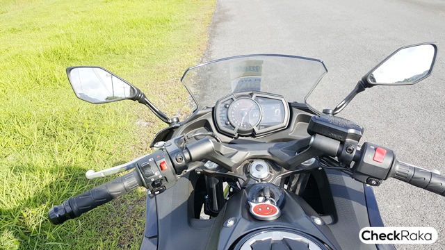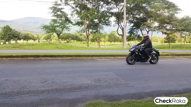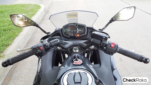 น้ำหนักของ Ninja 650 R นั้นเบามากๆ ครับ คล่องตัวทั้งการลัดเลาะในการจราจรติดขัดในเขตตัวเมืองได้ไม่ต่างกับรถขนาดซีซีเล็กๆ ด้วยความกว้างตัวรถเพียง 740 มม. ช่วงระยะของแฮนด์แคบมากเมื่อเทียบกับบางรุ่นในระดับเดียวกัน แต่กระจกข้างอาจกางมากไป ถ้าเก็บเข้าได้อีกจะยิ่งดีมากต่อการซอกแซกช่วงรถติด