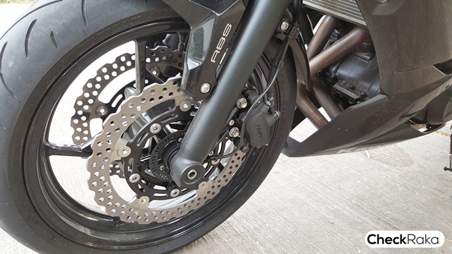 ระบบเบรกด้านหน้าตอบสนองได้ดี ส่วนด้านหลังนั้นจะลื่นได้ง่ายสักหน่อยจนระบบ ABS ทำงาน เพราะยางหลังของรถคันที่นำมาทดสอบนั้น ถูกสาย "เบิร์น" หน้ายางส่วนตรงกลางตัดตรงความโค้งลดลง เมื่อขับขี่ผ่านเส้นถนนจะมีอาการเลื้อยๆ บ้าง หากได้ยางสภาพสมบูรณ์คงไม่มีปัญหาในจุดนี้