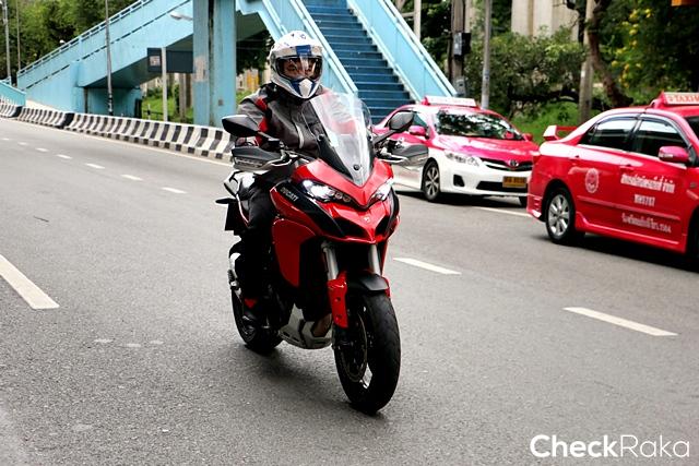 ผู้เขียนเริ่มต้นทำความรู้จักกับ Multistrada 1200 S เป็นครั้งแรกในวันรับรถทดสอบที่ ดูคาติ ไทยแลนด์ วิภาวดี 22 ด้วยมิติของตัวรถที่ใหญ่ น้ำหนักตัว 235 กิโลกรัม ก็คิดว่าเอาเรื่องอยู่ หลังเรียนรู้การปรับหน้าจอและระบบอินเตอร์เฟสต่างๆ คร่าวๆ จากเจ้าหน้าที่ ผู้เขียนก็บิดออกมาเลย โดยจุดหมายปลายทางของการเดินทางอยู่ที่อำเภอแก่งคอย จังหวัดสระบุรี ช่วงแรกใช้เวลาไม่นานก็เริ่มคุ้นเคยกับตัวรถ แต่ก็รู้สึกว่าขี่ได้ไม่สมูธเท่าไหร่ในช่วงความรอบต่ำ สัมผัสแรกๆ กับเบาะและท่านั่งนั้นให้ความสบาย ช่วยให้การควบคุมง่าย ความสูงของเบาะ 32.5 นิ้ว ยังพอไหวสำหรับผู้เขียนที่สูง 173 ซม. โดยใช้รองเท้าอัลไพน์สตาร์รุ่น SMX3 ทำให้ปลายเท้าแตะพื้นถึง