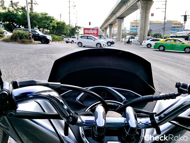 นับแต่เริ่มออกเดินทาง รู้สึกได้เลยว่าใช้งานได้สะดวก แต่สภาพผิวถนนค่อนข้างแย่ เปิดโอกาสให้เราได้ทดสอบระบบช่วงล่างที่ด้านหน้าเป็นแบบเทเลสโกปิค ด้านหลังแบบยูนิตสวิง และระหว่างทางช่วงแรกการจราจรค่อนข้างโล่งจึงทำความเร็วได้ต่อเนื่อง เมื่อถึงจุดหมายสถานตากอากาศบางปู ก็เลือกหาทำเลในการจอดถ่ายรถสวยๆ พร้อมชื่นชมกับบรรยากาศธรรมชาติ นกนางนวล ป่าชายเลน อันเป็นเสน่ห์ของที่นี่ จนเวลาล่วงเลยเข้าช่วงเย็นก็ได้เวลาเดินทางกลับ ซึ่งเป็นอีกช่วงสำคัญเพราะต้องขี่กลับมากองบัญชาการเช็คราคา.คอม ที่ชิดลม โดยดูกูเกิ้ลแมพแล้วเลือกใช้เส้นทางจากถนนสุขุมวิทมุ่งหน้าแยกไปทางถนนศรีนครินทร์ ตรงยาวไปตัดซ้ายเข้าซอยพัฒนาการ แล้วมุ่งไปออกถนนเพชรบุรี ขี่ไปถึงแยกเข้านานาเหนือออกถนนสุขุมวิทตรงสู่ชิดลม นับเป็นเส้นทางและช่วงเวลาที่พิสูจน์ถึงสมรรถนะการใช้งานในชีวิตประจำวันของ All New Honda PCX 150 อย่างแท้จริง