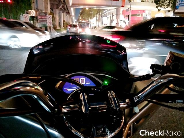 ช่วงขี่กลางคืนพบว่า ระบบไฟส่องสว่างหน้าแบบ LED ให้ความสว่างที่ชัดเจนจริงๆ แผงหน้าปัดระบบดิจิทัล สว่างสวย อ่านค่าและสัญลักษณ์ได้ชัดเจน และไม่ต้องกังวลแสงตกกระทบเพราะมีชิลด์กรองแสงด้านหน้าช่วย การขี่ฝ่าการจราจรในซอยพัฒนาการ เพชรบุรีตัดใหม่ นานา สุขุมวิท กลายเป็นเรื่องง่ายเพราะความคล่องตัวของ All New Honda PCX 150 ใหม่ ผู้เขียนมาถึงจุดหมายที่ชิดลมในช่วงค่ำพร้อมความรู้สึกประทับใจในสมรรถนะการใช้งานจริงของ All New Honda PCX 150 คันนี้