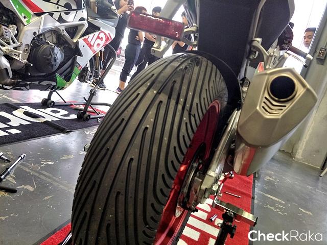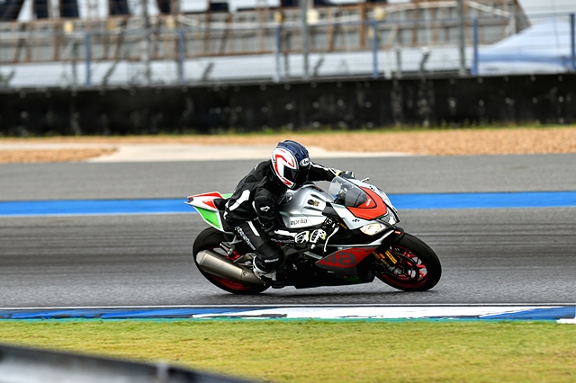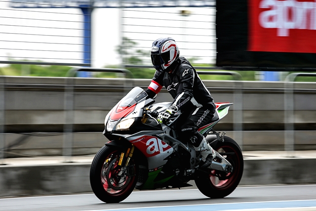 ผู้เขียนอยู่ในกลุ่มสุดท้าย ได้ขี่ช่วงเที่ยงซึ่งสภาพสนามค่อนข้างแห้งเกือบทั้งหมด เพียงแต่อากาศยังขมุกขมัวไม่มีแดด สำหรับรถที่ได้ลองเป็น New RSV4 RF ที่ให้ความแรงสูงสุดจากเครื่องยนต์ V4 อยู่ที่ 201 แรงม้า ที่ 13,000 รอบต่อนาที และมีแรงบิดสูงสุด 115 นิวตันเมตร ที่ 10,500 รอบต่อนาที จุดแตกต่างจากเวอร์ชันเก่าสำหรับ MY17 รุ่นนี้ที่เด่นๆ ก็มี ECU ใหม่สามารถประมวลผลได้ดีกว่าเดิม จนขยับรอบเครื่องขึ้นไปอีก 300 รอบต่อนาที รวมถึงมีการใช้ลูกสูบใหม่ที่เบาขึ้น ส่วนเบรกหน้าหันมาใช้คาลิปเปอร์ Brembo monobloc M50 พร้อมจานเบรกใหญ่ขึ้นเป็นขนาด 330 มม. ผ้าเบรกก็อัพเกรดให้ดีขึ้นด้วย นอกจากนี้ก็มีหน้าจอแบบ TFT, Pit limiter ให้ความสะดวกเวลาลงสนามแข่ง, Cruise Control ให้ความสบายตอนขี่ทางไกล, Quick Shifter ที่ให้การเปลี่ยนเกียร์เป็นไปอย่างรวดเร็วโดยไม่ต้องใช้คลัตช์ และระบบสื่อสารระหว่างรถกับผู้ขับผ่านทางบลูทูธ "V4-MP" ซึ่งจะช่วยวิเคราะห์ข้อมูลการขี่พร้อมแสดงผ่านสมาร์ทโฟน ส่วนความแตกต่างกับรุ่น อาร์เอฟ นอกจากราคาที่ห่างกันอยู่ 180,000 บาท ก็คือ ระบบช่วงล่าง ของอาร์เอฟเป็น Ohlins และได้ล้อเป็นงานฟอร์จ ขณะที่อาร์อาร์ เป็น Sachs