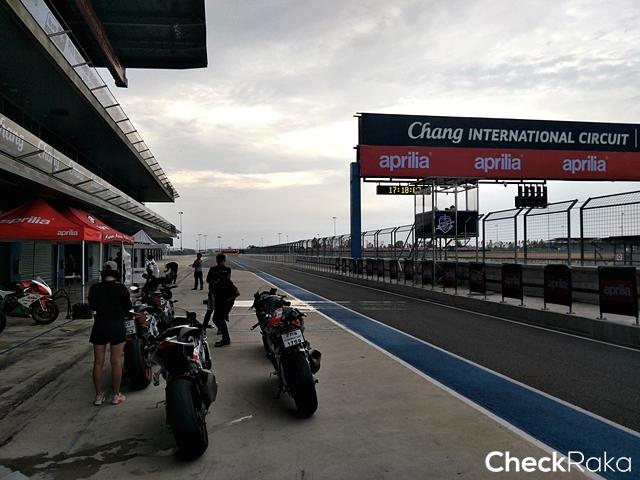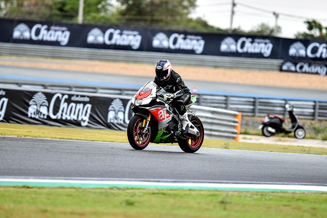 ผู้เขียนอยู่ในกลุ่มสุดท้าย ได้ขี่ช่วงเที่ยงซึ่งสภาพสนามค่อนข้างแห้งเกือบทั้งหมด เพียงแต่อากาศยังขมุกขมัวไม่มีแดด สำหรับรถที่ได้ลองเป็น New RSV4 RF ที่ให้ความแรงสูงสุดจากเครื่องยนต์ V4 อยู่ที่ 201 แรงม้า ที่ 13,000 รอบต่อนาที และมีแรงบิดสูงสุด 115 นิวตันเมตร ที่ 10,500 รอบต่อนาที จุดแตกต่างจากเวอร์ชันเก่าสำหรับ MY17 รุ่นนี้ที่เด่นๆ ก็มี ECU ใหม่สามารถประมวลผลได้ดีกว่าเดิม จนขยับรอบเครื่องขึ้นไปอีก 300 รอบต่อนาที รวมถึงมีการใช้ลูกสูบใหม่ที่เบาขึ้น ส่วนเบรกหน้าหันมาใช้คาลิปเปอร์ Brembo monobloc M50 พร้อมจานเบรกใหญ่ขึ้นเป็นขนาด 330 มม. ผ้าเบรกก็อัพเกรดให้ดีขึ้นด้วย นอกจากนี้ก็มีหน้าจอแบบ TFT, Pit limiter ให้ความสะดวกเวลาลงสนามแข่ง, Cruise Control ให้ความสบายตอนขี่ทางไกล, Quick Shifter ที่ให้การเปลี่ยนเกียร์เป็นไปอย่างรวดเร็วโดยไม่ต้องใช้คลัตช์ และระบบสื่อสารระหว่างรถกับผู้ขับผ่านทางบลูทูธ "V4-MP" ซึ่งจะช่วยวิเคราะห์ข้อมูลการขี่พร้อมแสดงผ่านสมาร์ทโฟน ส่วนความแตกต่างกับรุ่น อาร์เอฟ นอกจากราคาที่ห่างกันอยู่ 180,000 บาท ก็คือ ระบบช่วงล่าง ของอาร์เอฟเป็น Ohlins และได้ล้อเป็นงานฟอร์จ ขณะที่อาร์อาร์ เป็น Sachs