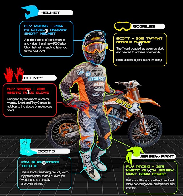 ชุดสำหรับขี่ทางฝุ่นหรือโมโตครอส ควรเป็นเนื้อผ้าบางเบาให้สัมผัสนุ่มสบาย ช่วยให้เคลื่อนไหวได้สะดวกคล่องตัว ทั้งการยืน เอี้ยวตัวเพื่อเลี้ยวโค้ง เพราะจะคล่องตัวกมากกว่าการใส่ชุดขับขี่แบบปกติ