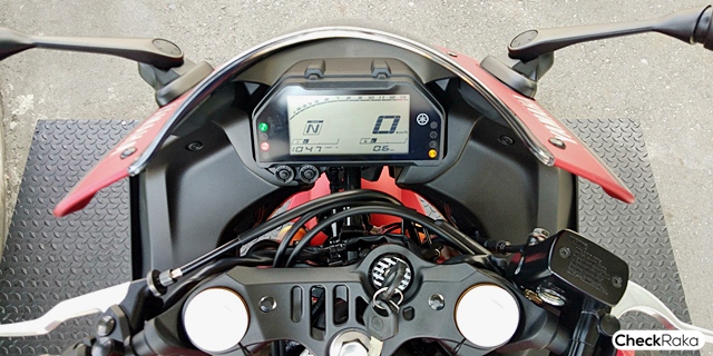 NEW YZF - R3 หน้าปัด LCD ใหม่ ใช้แผงคอใหม่ พร้อมแฮนด์จับอะลูมิเนียมสไตล์เฉพาะตระกูล R - Series เพื่อความสมดุลในการขับขี่ทั้งบนถนน และในสนามแข่ง โช้คอัพหน้าแบบอัพไซด์ดาวน์ ระบบกันสะเทือนหลังแบบ Monocross ทำงานร่วมกับโช้คอัพหลัง KYB ที่สามารถปรับระดับได้ พร้อมยางแบบเรเดียลจาก New Dunlop SPORTMAX GPR - 300