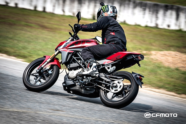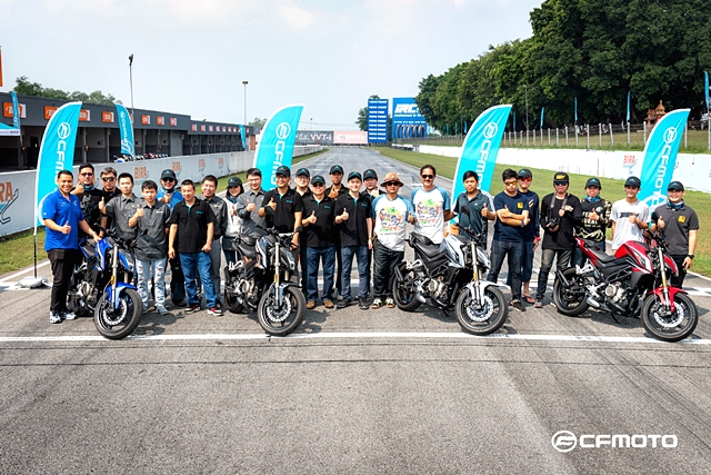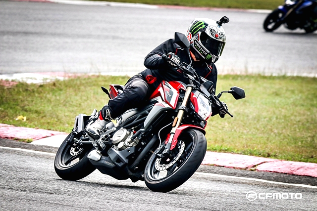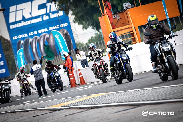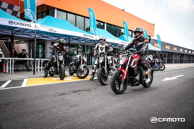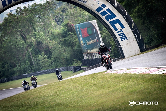 การทดสอบทาง CFMOTO ได้นำรถทั้ง 2 รุ่นย่อยมาให้สื่อมวลชนได้ลองสลับขี่กันอย่างเต็มที่ โดยแบ่งเป็น 2 ช่วง เริ่มจากการขี่รอบสนามหยุดตามสเตชั่น ซึ่งแบ่งไว้ทั้งหมด 4 จุด เริ่มจากออกตัวด้านหน้ากริดสตาร์ท ออกตัวผ่านไปหยุดหลังออกจากโค้งที่ 3 เพื่อเข้าสู่สถานีสลาลอม ดูความคล่องตัวและการควบคุมตัวรถผ่านกรวย จากนั้นต่อด้วยโค้งยาวๆ ที่ทำความเร็วได้เต็มที่ โดยวิ่งผ่านโค้ง 4 และ 5 แล้วไปหยุดเพื่อลองระบบเบรกก่อนออกตัวสู่เข้าโค้งต่อไป จากนั้นเป็นการทดสอบการเข้าโค้งเอส โดยเร่งผ่านโค้ง 6-7 และ 8-9 อย่างต่อเนื่อง ก่อนเจอโค้ง 10 ที่ท้าทายการควบคุมของตัวรถ และหยุดที่จุดสุดท้ายก่อนเข้าโค้ง 11 เพื่อทดสอบอัตราเร่งในช่วงทางตรงยาว ก่อนหยุดหน้ากริดเพื่อชะลอความเร็ว แล้วเข้าสู่รอบต่อไป
