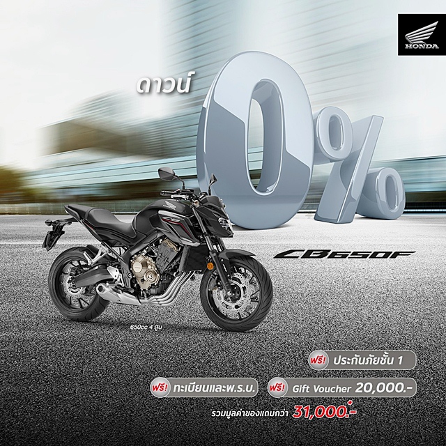 Honda CB650F ราคา 288,000 บาท ดาวน์ 0 % ออกรถได้ทันที พร้อมรับของแถมสุดพิเศษ รวมมูลค่าสูงสุดถึง 31,000 บาท*