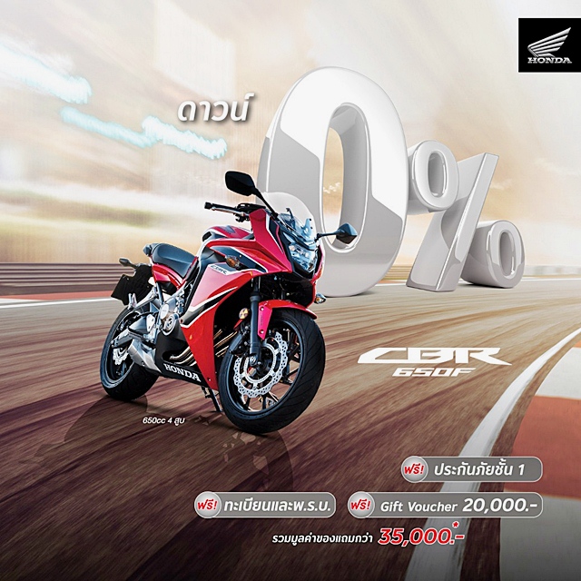 Honda CBR650F ราคา 303,000 บาท ดาวน์ 0 % ออกรถได้ทันที พร้อมรับของแถมสุดพิเศษ รวมมูลค่าสูงสุดถึง 35,000 บาท*