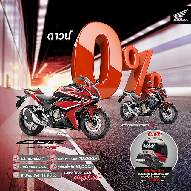 Honda CBR500R ราคา 215,000 บาท หรือ CB500F ราคา 210,000 บาท ดาวน์ 0 % ออกรถได้ทันที พร้อมรับของแถมสุดพิเศษ รวมมูลค่าสูงสุดถึง 42,000 บาท*