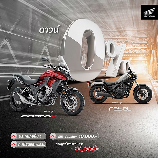 เมื่อซื้อรถ Honda CB500X ราคา 220,000 บาท หรือ Honda Rebel 500 ราคา 220,000 บาท ดาวน์ 0 % ออกรถได้ทันที พร้อมรับของแถมสุดพิเศษ รวมมูลค่าสูงสุดถึง 20,000 บาท*