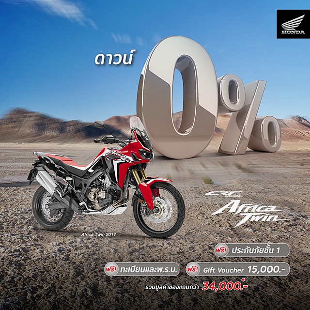 Honda Africa Twin 2017 ราคาเริ่มต้น 550,000 บาท ดาวน์ 0 % ออกรถได้ทันที พร้อมรับของแถมสุดพิเศษ รวมมูลค่าสูงสุดถึง 34,000 บาท*