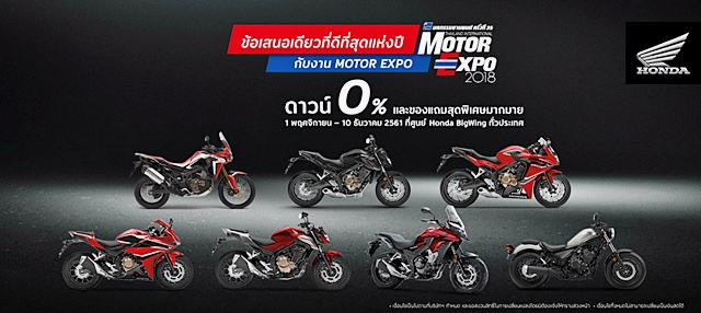 ไปลองสัมผัส ลองนั่งมอเตอร์ไซค์ฮอนด้าให้สะใจ พร้อมโปรโมชั่นสุดพิเศษอีกมากมายในงาน Motor Expo 2018 ระหว่างวันที่ 29 พฤศจิกายน - 10 ธันวาคม ณ อิมแพค ชาเลนเจอร์ 1 - 3 เมืองทองธานี