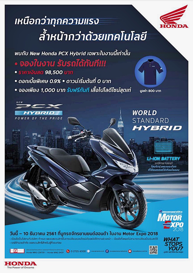 Honda PCX150 Hybrid ราคาเพียง 98,500 บาท รับดอกเบี้ยพิเศษ 0.9% ดาวน์เริ่มต้นที่ 0 บาท พร้อมรับฟรีเสื้อโปโลมูลค่า 800 บาท ทันที เมื่อจองรถภายในงาน MOTOR EXPO 2018 เพียง 1,000 บาท ระหว่างวันที่ 29 พฤศจิกายน - 10 ธันวาคม นี้ เท่านั้น