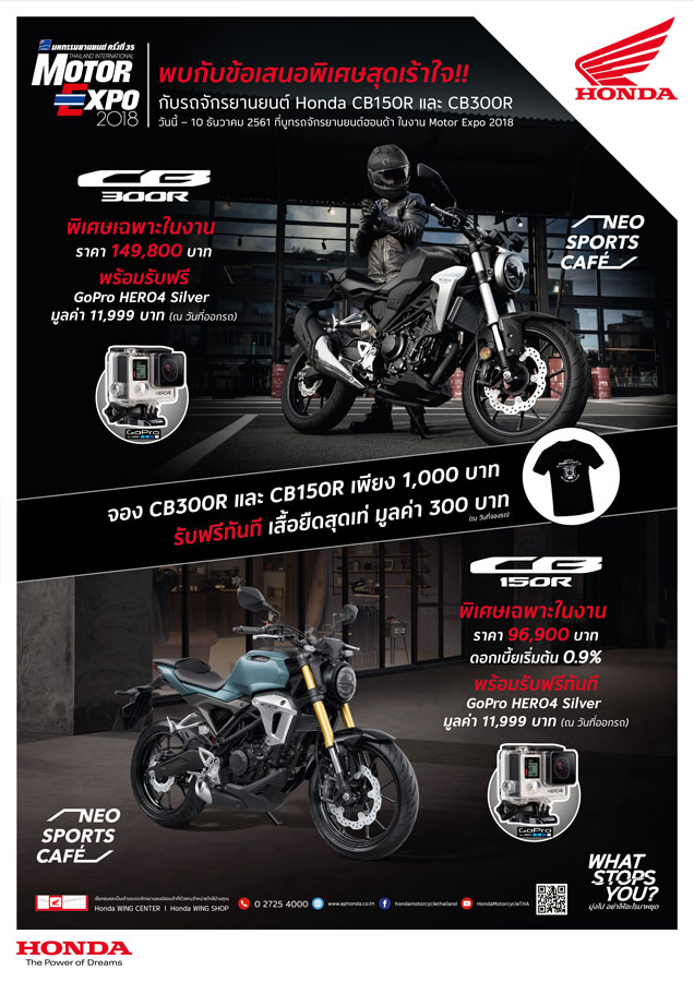 Honda CB300R จองในงานราคาพิเศษ 149,800 บาท และ Honda CB150R ราคาพิเศษในงานเพียง 96,900 บาท ดอกเบี้ยเริ่มต้น 0.9% พร้อมรับทันทีกล้อง GoPro Hero 4 Silver มูลค่า 11,999 บาท นอกจากนี้ใช้เงินจองเพียง 1,000 บาท รับเสื้อสุดคูลมูลค่า 300 บาท เรียกว่างานนี้ได้สัมผัสครบทุกรุ่น ทั้งรถใหญ่ไปจนถึงรถเล็กสเปคบิ๊กไบค์ ในบูธ A.P.Honda