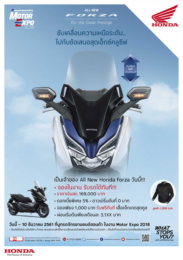 All New Honda Forza 300 จองในงานราคาเงินสด 169,000 บาท รับทันทีดอกเบี้ย 5% ดาวน์เริ่มต้น 0 บาท จองเพียง 1,000 บาท รับฟรี เสื้อแจ็คเก็ตสุดคูล ผ่อนเริ่มต้นเพียงเดือนละ 3,1xx บาท