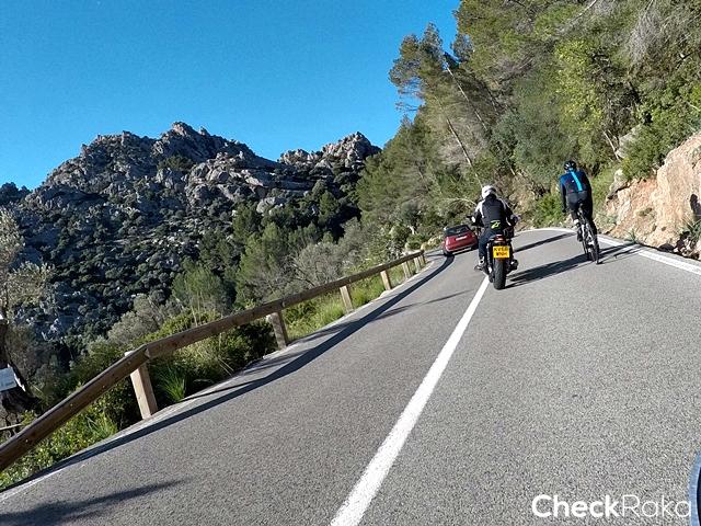 อย่างไรก็ตามด้วยอุณหภูมิราว 10 กว่าองศา เมื่อขี่แล้วโดนลมปะทะตัวตลอดเวลา เสื้อแจ็คเก็ตแบบแอร์โฟลว์ของเมืองร้อนก็กลายเป็นตัวนำความเย็นผ่านอินเนอร์กระแทกร่างตลอดเวลา นับเป็นความทรมานที่รบกวนการขี่ไม่น้อย และเป็นการประเมินสถานการณ์ที่ผิดพลาดของผู้เขียน แม้ตัวรถมีฮีทกริ๊ปและใส่ถุงมือขี่แบบวินเตอร์พร้อมปรับความร้อนสูงสุด แต่ก็ไม่ได้ช่วยในช่วงตัวที่ปะทะลมหนักมาก ยิ่งตัวรถเป็นแบบ naked จุดแรกที่ทีมมาแวะทานกาแฟร้อนก่อนที่จะขี่ไปเผชิญความโหดของเส้นทางเขาเป็นร้านกาแฟชื่อ Eu monument ในเมือง Pollenca ซึ่งที่ผ่านมาเป็นทางเรียบตลอด