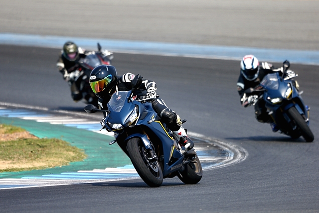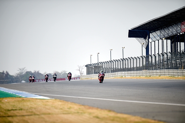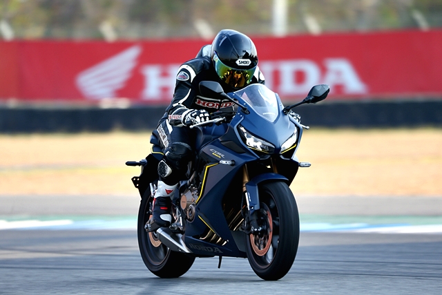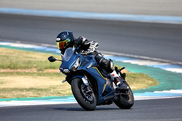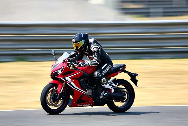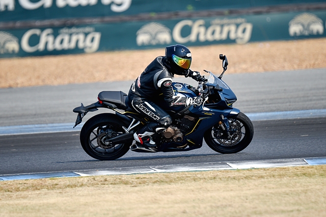 เริ่มต้นช่วงแรกของการทดสอบกับรุ่น CBR650R โดยได้ขี่คันสี MAT JEANS BLUE METALLIC ซึ่งเป็นสีใหม่ การทดสอบเริ่มจากกลุ่ม A ก่อน ส่วนรถที่เตรียมไว้ทั้งหมดมีคละรุ่น 500R, 650R และ 1000RR หลังจากกลุ่ม A เข้ามาทีมงานตรวจเช็ครถเรียบร้อย กลุ่ม B ก็เข้าสแตนด์บายต่อ รอบแรกออกจากพิตมีกรวยสลาลอมดักเพื่อให้วอร์มก่อนเข้าแทร็ค แต่ละกลุ่มก็มีนักแข่งจากทีมฮอนด้าร่วมขี่ไปพร้อมกันเพื่อดูและแนะนำเทคนิคการขี่เพิ่มเติม ผู้เขียนออกไปขี่รอบสนามทั้งหมด 10 กว่ารอบ ประทับใจกับการตอบสนองของเครื่องยนต์ ท่านั่งที่เอื้อให้ขี่ในแทร็คง่ายขึ้น ระบบเบรกที่เอาอยู่ การควบคุมตัวรถในโค้ง ช่วงทางตรงที่ใช้ความเร็วสูงการใช้เกียร์ต่อเกียร์ในความต่อเนื่องอย่างฉับไว ตัวรถนิ่งอย่างน่าพอใจ ส่วนหนึ่งจากการปรับปรุงโช๊คอัพหน้าเป็นแบบหัวกลับ (Upside down) ขนาด 41 มิลลิเมตรจาก SHOWA สุดทางตรงยกและชะลอเบรกได้มั่นใจขึ้นเรื่อยๆ ในแต่ละรอบด้วยดิสก์เบรกคาลิปเปอร์ 4 พอท ในการปรับเปลี่ยนเกียร์แต่ละครั้งผู้เขียนเหลือบมองได้อย่างชัดเจนด้วยเรือนไมล์ดิจิตอลใหม่ของ CBR650R นั้นดูง่าย ดูคล้ายรุ่นพี่ CB 1000R ตัว Naked สำหรับการเบรกและชิฟท์เกียร์ลงก่อนเข้าโค้งในหลายๆ โค้ง ตัวรถที่มีระบบเทคโนโลยี Assist & Slipper Clutch ได้ช่วยลดอาการกระชากของล้อหลังในช่วงเปลี่ยนเกียร์สูงลงมาเกียร์ต่ำได้อย่างน่าพอใจคือ ถ้าไปขี่บนถนนเปิดทั่วไปเป็นประโยชน์มาก รวมทั้งระบบ Emergency Stop Tail Light แสดงไฟฉุกเฉินเมื่อรถเบรกกะทันหันด้วย
