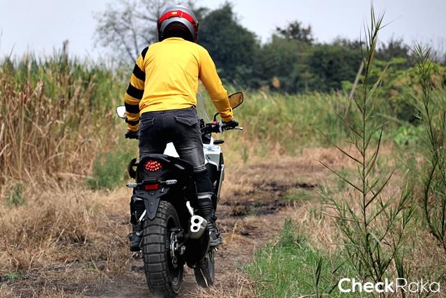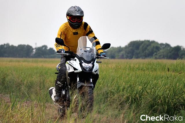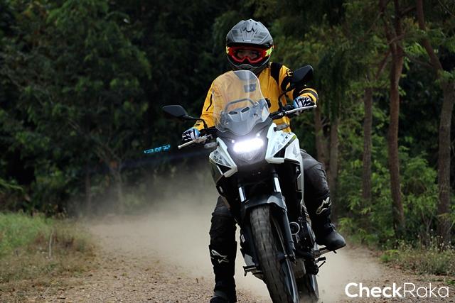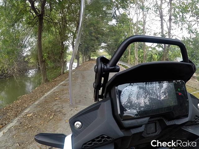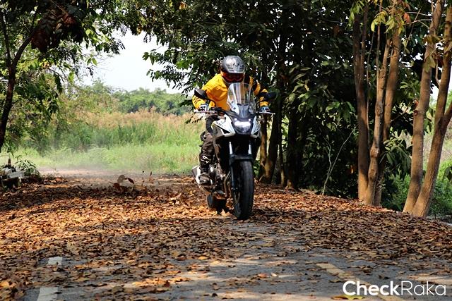 สัมผัสแรกที่ได้ลองนั่งพร้อมทำความคุ้นเคย พบว่าตำแหน่งการวางมือ เท้า ตอบสนองการใช้งานเบื้องต้นได้ดี เบาะอาจสูงไปบ้างสำหรับใครที่สูงไม่เกิน 170 ซม. จริงๆ ผู้เขียนสูง 173 ซม. ตอนขี่ใส่บู๊ทยาวก็กำลังดี ถ้ามองว่ากำลังขี่รถสไตล์แอดเวนเจอร์อยู่ เมื่อลองขี่บนถนนในตัวเมืองไปสักพักก็พบว่า หน้าจอใหม่ให้การมองเห็นที่ง่ายขึ้น รอบเครื่องยนต์ตอบสนองดีมีแรงให้ใช้พอตั้งแต่รอบต่ำ เมื่อเริ่มทำความเร็วได้มากขึ้นลมปะทะก็ถูกบดบังด้วยชิลด์หน้าใหม่ได้อย่างน่าประทับใจ ตำแหน่งปุ่มต่างๆ บนแฮนด์บาร์ไม่ได้มีอะไรเปลี่ยนแปลงไปมากก็ยังคงใช้งานได้ถนัดมือ ด้านระยะห่างตำแหน่งแป้นเกียร์กับ foot pegs ก็มากพอให้งัดด้วยบู๊ทยาวได้สะดวก พอขี่ไปถึงอำเภอสามโคกเลาะเลี้ยวจากถนนดำสู่ช่วงออฟโรด พบว่าตัวรถที่ผ่านวิ่งบนพื้นดินแข็ง เนินหลุมต่างๆ สามารถเก็บแรงกระแทกได้ดีอย่างน่าพอใจ แม้ตัวล้อเป็นแม็กนีเซียมก็ตาม แต่ช่วงด้านหน้าที่ใช้โช๊คอัพขนาด 41 มม. ระยะยุบ 5.3 นิ้ว ผสานการทำงานกับด้านหลังที่เป็นโช๊คอัพเดี่ยวพร้อมปรับพรีโหลดได้ 9 ระดับ ทำให้การขี่บนเส้นทางขรุขระสบายขึ้น