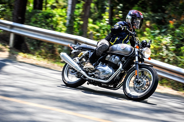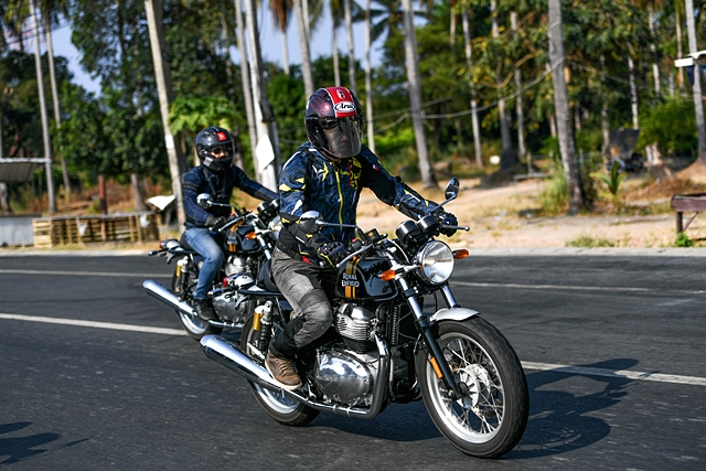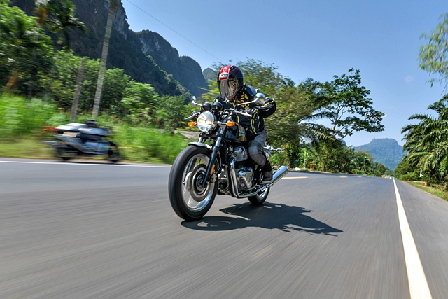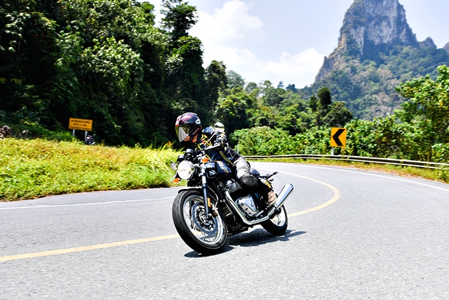 เช้าวันที่ 22 การทดสอบสุดตื่นเต้นก็ได้เริ่มขึ้น โดยแบ่งสื่อฯ ออกเป็น 2 กลุ่มๆ ละ 8 คน เพื่อแยกทดสอบรอยัล เอนฟิลด์ อินเตอร์เซปเตอร์ 650 และ คอนติเนนทัล จีที 650 โดยทีมงานได้ทดสอบรุ่น คอนติเนนทัล จีที ก่อนในช่วงครึ่งวันแรก เส้นทางเป็นการผสมผสานระหว่างไฮเวย์กับทางขึ้น-ลงเขา ระยะทางรวมราว 115 กม. มุ่งหน้าเข้าจังหวัดพังงา ช่วงแรกที่ออกตัวจากโรงแรมฯ ขบวนฯ วิ่งกันบนไฮเวย์ยาวๆ ผู้เขียนเพิ่งเคยคร่อม คอนติเนนทัล จีที ครั้งแรกพบว่าท่านั่งไม่ได้ก้มจนน่ากังวลตามสไตล์คาเฟ่ เรเซอร์อย่างที่คิด ระดับแฮนด์ออกแบบมาให้จับสบาย และมั่นใจไปกับการใช้ความเร็วที่ค่อนข้างสูงตลอด ในบางช่วงขบวนฯ มีโอกาสใช้ความเร็วเต็มที่ เพื่อสัมผัสถึงสมรรถนะของเครื่องยนต์ 2 สูบ ทวินใหม่ พลัง 47 แรงม้าของรอยัล เอนฟิลด์ การตอบสนองเมื่อเปิดคันเร่งและช่วงเปลี่ยนเกียร์นับว่าทำได้ไหลลื่นและน่าประทับใจมาก ผู้เขียนลองทำความเร็วเต็มที่วัดได้จากหน้าปัดอยู่ที่ 175 กม./ชม. จริงๆ ก็สามารถไหลไปได้อีก แต่พบว่าช่วงล่างด้านหน้าเริ่มออกอาการเต้นบ้าง จึงลดความเร็วลงอยู่ระดับ 140-150 กม./ชม. ซึ่งเป็นความเร็วในการเดินทางช่วงแรก