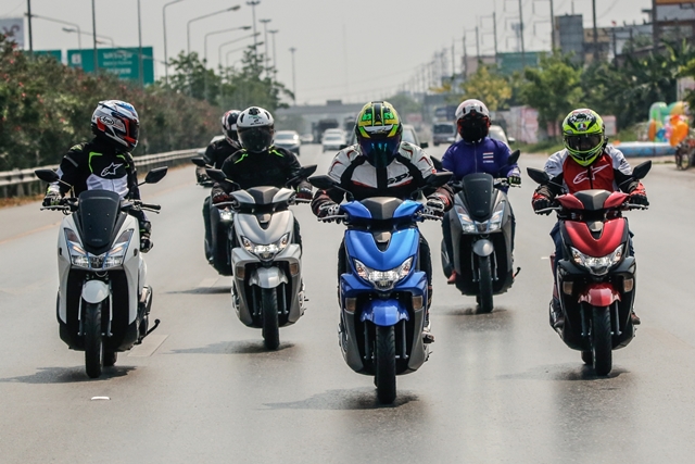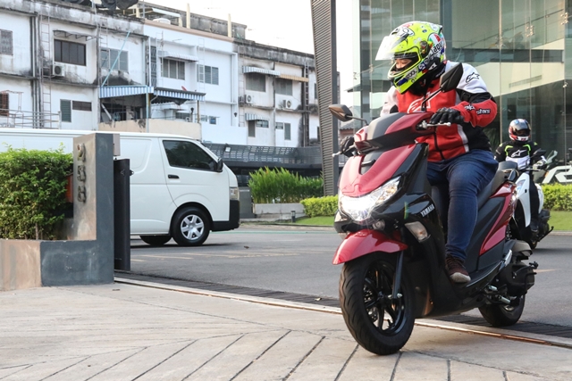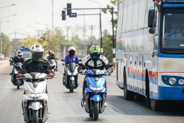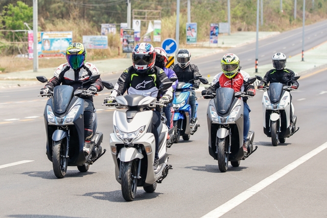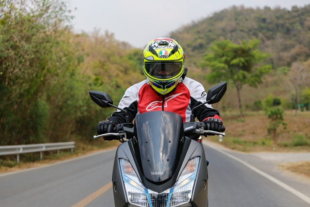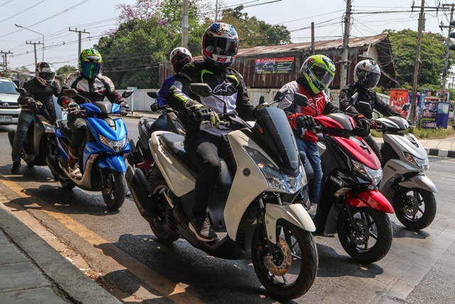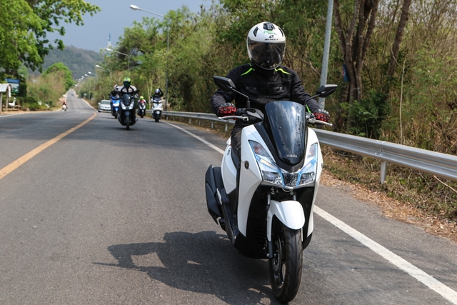 ช่วงบ่ายได้เวลาสลับพลัดเปลี่ยนมาลอง Yamaha Lexi 125 เครื่องยนต์ VVA กันบ้าง จากที่เคยสัมผัสในทริปที่เดินทางไป พัทยา มาลองขับกันแบบชิวๆ ถนนโล่งๆ มีโค้งให้สาดกันบ้างเล็กน้อย เพื่อเดินทางต่อไปยังสวนน้ำ ในอำเภอสวนผึ้ง และเหมือนฟ้าฝนอยากให้เราลองสมรรถนะการเกาะถนนของรถสไตล์ครอบครัว สาดสายฝนกันลงมาให้ชุ่มฉ่ำ แต่ทุกคนก็มั่นใจในสมรรถนะ และยางที่ยึดเกาะถนน ทำให้การเข้าโค้งแม้ต้องระมัดระวังมากขึ้นกว่าเดิม ก็ถือว่าเป็นบททดสอบว่าสกู๊ตเตอร์เครื่องยนต์แค่ 125 ก็พาคุณไปถึงจุดหมายได้อย่างปลอดภัย
