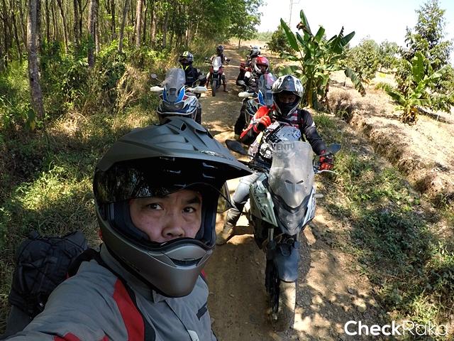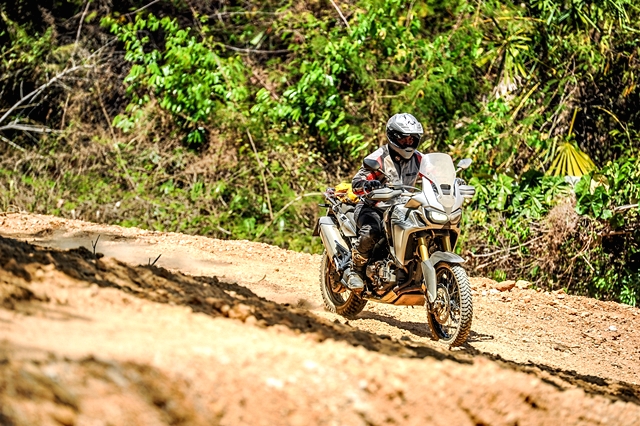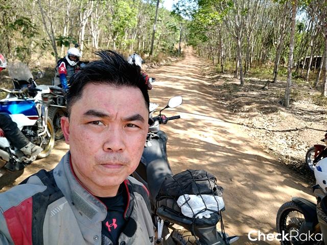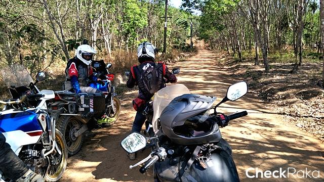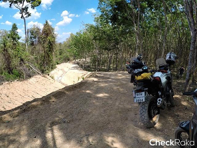 นอกจากนี้ความท้าทายของเส้นทางช่วงที่ต้องขี่บนแนวดินกั้นช้างคือ ไม่มีแนวกั้นใดๆ ถ้าหลุดหรือพลาดไปก็ตกเนินลงข้างทางที่ค่อนข้างสูง และต้องต่อสู้กับอากาศที่ร้อนระอุตลอดช่วงบ่าย ผู้เขียนพบว่าบางช่วงระดับชีพจรเต้นสูงถึง 140 ยิ่งถ้าต้องออกแรงมากเป็นพิเศษ ด่านที่สองเป็นสุดยอดความท้าทายของทริปคือ การไต่เนินชันแล้วต้องหักเลี้ยวขวากลางเนินที่พื้นร่วนซุยสุดๆ ก่อนเข้าไต่โค้งซ้ายขึ้นยอดเนินต่อ จุดนี้ดักไปได้หลายคันที่ต้องยอมสยบให้ ผู้เขียนก็เช่นกันต้องลงแล้วอาศัยเพื่อนร่วมทริปช่วยกันดันรถขึ้น หลังจากนั้นก็ไม่ง่าย เพราะเป็นเนินเล็กขึ้นลง เลี้ยวซ้ายขวาเต็มไปด้วยกรวดลอย อากาศร้อนยังคงเล่นงานเราตลอดทาง เป้น้ำเป็นของจำเป็นสำหรับทริปแบบนี้ แต่การได้น้ำดื่มเย็นๆ จากร้านขายของชำชาวบ้านระหว่างทางนี่เหมือนสวรรค์ชัดๆ ไม่นานเราก็มาถึงด่านสาม ที่แม้เป็นทางขึ้นเนินสูงยาว แต่ท้าทายด้วยความชันแบบต้องแหงนหน้ามอง การทำความเร็วอย่างเหมาะสมก่อนขึ้นเนินเป็นเรื่องจำเป็น และการเลี้ยงรอบใช้เกียร์ให้พอดีจนถึงก็เช่นกัน ถ้าส่งมาเบาไป รถก็อาจหมดแรง ต้องเติมช่วงกลางเนินก็มีสิทธิตะกุยดินฟรีทิ้ง แน่นอนว่าต้องปิดแทร็คชันก่อน ผู้เขียนที่สลับมาขี่ CB500X ใหม่อีกครั้ง ใช้เกียร์ 2 ในการขึ้นเนินด่านนี้ ดันขึ้นไปจนเกือบถึงยอด เจอพื้นดินร่วนจนทำให้ล้อฟรี แต่รักษารอบจนไต่ผ่านขึ้นไปได้ ส่วนหนึ่งชอบ Honda CB500X ใหม่ ปี 2019 ที่เบากว่า CRF1000L ควบคุมง่ายกว่าถ้าเทียบกับ DCT