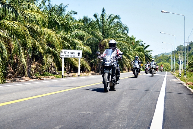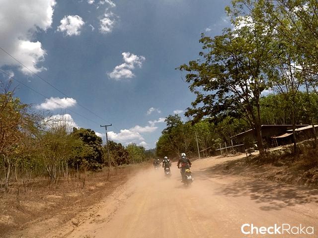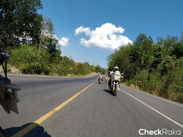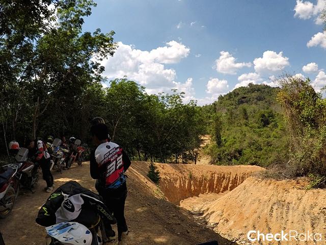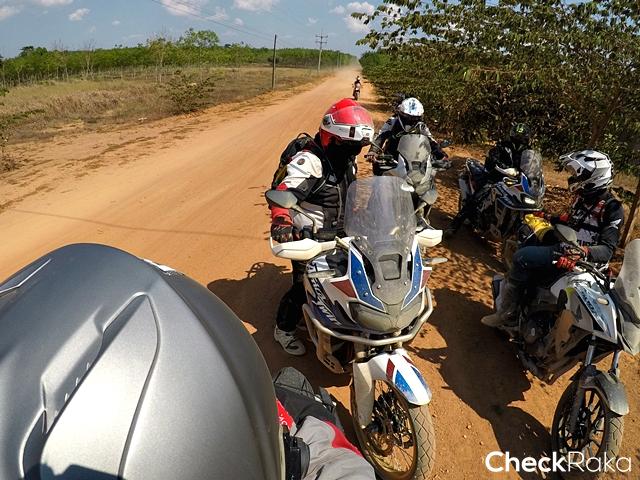 สมาชิกสนุกสนานกับการขี่บนทางฝุ่นพื้นแข็งตลอดทาง ข้อดีของการขี่ในช่วงหน้าร้อน แต่ก็แลกกับอากาศที่ร้อนจัด รีดเหงื่อกันตลอดทางเช่นกัน ขี่กันมาจนเจอแนวกั้นช้างป่าที่ต้องระวังในการขี่ เพราะเป็นการขุดดินขึ้นมาทำแนว ลักษณะพื้นค่อนข้างร่วนซุย ด่านแรกก็เจอกับเนินสูงขึ้นไปแล้วหักศอก ถ้าขึ้นไปเร็วเกินแล้วเลี้ยวไม่ทันก็อาจล่วงลงมาหลังเนินอีกฝั่ง นับเป็นความท้าทายแรกที่เจอ ผู้เขียนที่ขี่ CRF1000L Africa Twin ก่อนขึ้นได้ปิดระบบแทร็คชันคอนโทรล แล้วเดินคันเร่งเรียบๆ ขึ้นไปจนถึงยอดเนินแล้วหักขวาจอดได้อย่างปลอดภัย ความน่ากลัวคือ ช่วงที่พื้นผิวเป็นดินร่วนซุยผสมกรวด และพื้นที่ไม่เท่ากัน อย่างที่รู้กันว่าการขี่แอดเวนเจอร์บิ๊กไบค์ที่เบาะสูงแล้วจอดไม่ถูกจังหวะบนพื้นเรียบไม่เท่ากัน อาจส่งผลให้ลงไปวัดพื้นเล่นง่ายๆ