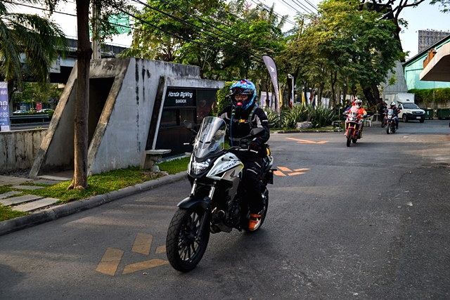 เราเดินทางกันในสายใช้ถนนรามอินทรามุ่งไปทางมีนบุรี ฝ่าการจราจรอันคับคั่งในช่วงตัวเมือง ซึ่ง 500X ก็ตอบสนองการขี่ผ่านช่องทางต่างๆ บนถนนได้เป็นอย่างดี พร้อมให้อัตราเร่งและชะลอเบรกได้อย่างน่าพอใจ เมื่อมาถึงช่วงสุวินทวงศ์ที่ถนนอยู่ในระหว่างการก่อสร้าง การจราจรติดขัดจากการถูกบีบเหลือเลนเดียวหลายช่วง และด้านข้างมักเป็นทางดินมีทรายลงไว้รอเทคอนกรีต ก็เลยเลือกลงไปวิ่งประหยัดเวลา นับเป็นข้อดีของแอดเวนเจอร์ไบค์ โดยเฉพาะจากฮอนด้า บิ๊กไบค์ ที่มีราคาเข้าถึงง่าย