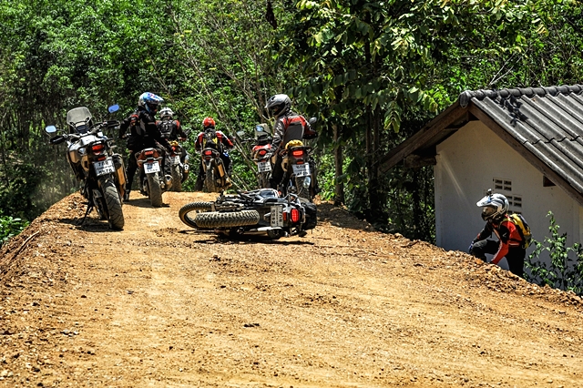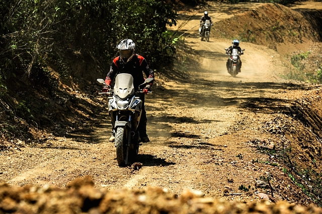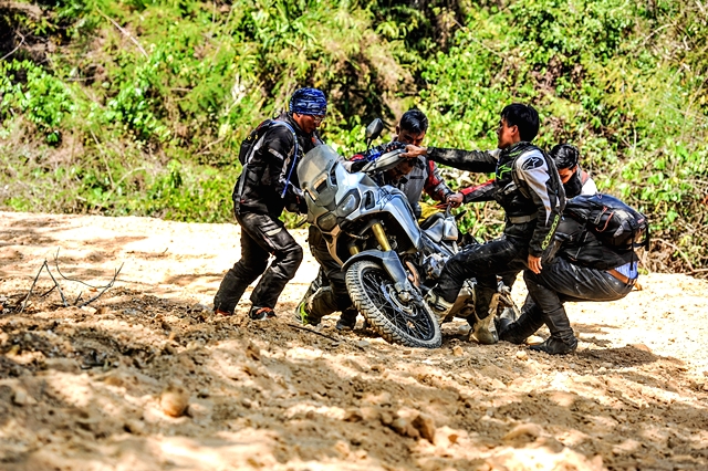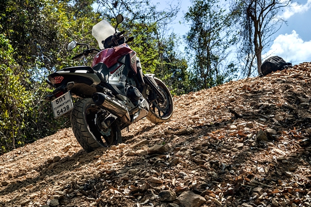 นอกจากนี้ความท้าทายของเส้นทางช่วงที่ต้องขี่บนแนวดินกั้นช้างคือ ไม่มีแนวกั้นใดๆ ถ้าหลุดหรือพลาดไปก็ตกเนินลงข้างทางที่ค่อนข้างสูง และต้องต่อสู้กับอากาศที่ร้อนระอุตลอดช่วงบ่าย ผู้เขียนพบว่าบางช่วงระดับชีพจรเต้นสูงถึง 140 ยิ่งถ้าต้องออกแรงมากเป็นพิเศษ ด่านที่สองเป็นสุดยอดความท้าทายของทริปคือ การไต่เนินชันแล้วต้องหักเลี้ยวขวากลางเนินที่พื้นร่วนซุยสุดๆ ก่อนเข้าไต่โค้งซ้ายขึ้นยอดเนินต่อ จุดนี้ดักไปได้หลายคันที่ต้องยอมสยบให้ ผู้เขียนก็เช่นกันต้องลงแล้วอาศัยเพื่อนร่วมทริปช่วยกันดันรถขึ้น หลังจากนั้นก็ไม่ง่าย เพราะเป็นเนินเล็กขึ้นลง เลี้ยวซ้ายขวาเต็มไปด้วยกรวดลอย อากาศร้อนยังคงเล่นงานเราตลอดทาง เป้น้ำเป็นของจำเป็นสำหรับทริปแบบนี้ แต่การได้น้ำดื่มเย็นๆ จากร้านขายของชำชาวบ้านระหว่างทางนี่เหมือนสวรรค์ชัดๆ ไม่นานเราก็มาถึงด่านสาม ที่แม้เป็นทางขึ้นเนินสูงยาว แต่ท้าทายด้วยความชันแบบต้องแหงนหน้ามอง การทำความเร็วอย่างเหมาะสมก่อนขึ้นเนินเป็นเรื่องจำเป็น และการเลี้ยงรอบใช้เกียร์ให้พอดีจนถึงก็เช่นกัน ถ้าส่งมาเบาไป รถก็อาจหมดแรง ต้องเติมช่วงกลางเนินก็มีสิทธิตะกุยดินฟรีทิ้ง แน่นอนว่าต้องปิดแทร็คชันก่อน ผู้เขียนที่สลับมาขี่ CB500X ใหม่อีกครั้ง ใช้เกียร์ 2 ในการขึ้นเนินด่านนี้ ดันขึ้นไปจนเกือบถึงยอด เจอพื้นดินร่วนจนทำให้ล้อฟรี แต่รักษารอบจนไต่ผ่านขึ้นไปได้ ส่วนหนึ่งชอบ Honda CB500X ใหม่ ปี 2019 ที่เบากว่า CRF1000L ควบคุมง่ายกว่าถ้าเทียบกับ DCT
