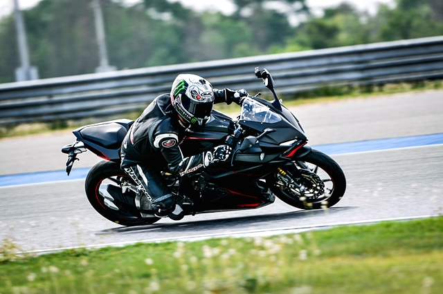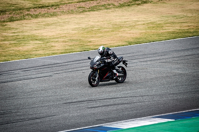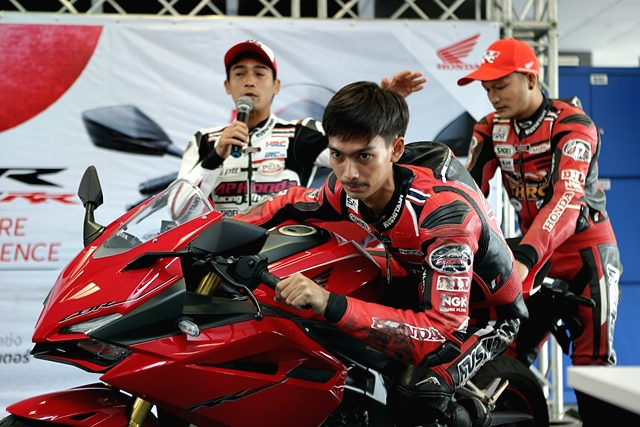 เริ่มทดสอบได้ขี่คันสีแดง (Grand Prix Red) ก่อน เมื่อลองนั่งคร่อมด้วยชุดเรซซิ่งสูท เบาะนั่งที่สูง 790 มม. ให้ความสบายในการขึ้น-ลง ท่านั่ง ตำแหน่งแฮนด์ องศาการวางเท้า ให้ความรู้สึกแตกต่างจากรุ่นพี่ในตระกูล CBR 500&650 ซีรี่ส์ ที่เพิ่งทดสอบในสนามแห่งนี้เมื่อเดือนกุมภาพันธ์ที่ผ่านมา