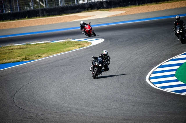 ช่วงทดสอบสองและสามผู้เขียนเริ่มต้นขี่ด้วยโหมด Sport ไปสักพักก็หันไปปรับเป็น Sport+ รอบที่แช่คลานออกจากพิทมาด้วยเกียร์สองไหลพรวดตวัดขึ้นไปจนรู้สึกได้ การขี่ในช่วงนี้เน้นการเปลี่ยนเกียร์ที่ 12,500 รอบต่อนาทีตลอด และมีโอกาสใช้เกียร์ 6 จากโค้ง 1-3 หลายรอบจนเริ่มขยับจุดเบรกให้ลึกขึ้น เพราะมั่นใจระบบเบรกของตัวรถที่รับมือได้ดีทุกย่านความเร็ว จังหวะพลิกเข้าโค้ง ตัวรถตอบสนองเป็นหนึ่งเดียว ให้สมดุลที่ดี ทำให้ง่ายและสนุกไปกับการขี่ในสนาม จากโค้ง 4 ไป โค้ง 5 ช่วงก่อนถึงโค้งเป็นจังหวะที่น่าอึดอัดสำหรับการขึ้นหรือลงเกียร์ ผู้เขียนใช้แบนด์วิธเกียร์ 5 ลากยาวเข้าโค้ง ก่อนไปยก เบรกและลงเกียร์ 4 เข้าโค้ง 6 ลากยาวเข้า 7 ดันขึ้นเป็น 5 แล้วลงมาที่ 4 โยนเข้าโค้ง 8 ผ่านโค้ง 9 ต่อ โค้ง 10 ที่เป็นเอส พบว่าการถ่ายน้ำหนักทำได้อย่างคล่องตัว ตัวรถตอบสนองไปในทิศทางอย่างใจต้องการ การเบรกจากความเร็วสูง แล้วลดเกียร์ลงก่อนเข้าโค้ง 12 CBR250RR ที่แม้ไม่มีสลิปเปอร์คลัตช์แต่ตัวรถก็รักษาอาการได้อย่างเสถียรไม่มีแกว่ง การเร่งออกจากโค้งด้วยเกียร์ 2 พร้อมไล่ความเร็วอย่างต่อเนื่องพบว่า พลังจากเครื่องยนต์ 249 ซีซี DOHC 4 วาล์ว 2 สูบเรียง ระบายความร้อนด้วยน้ำ ถ่ายทอดพลังออกมาได้อย่างไหลลื่นจังหวะเปลี่ยนเกียร์ที่รอบสูงตัวรถรักษาสมดุลได้ดี จนถึงจุดเบรก ลดเกียร์มาเป็น 4 แล้วโยนเข้าโค้งแรก สนุกกับ CBR250RR ต่อไปจนจบ