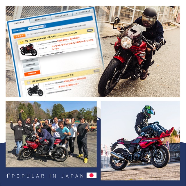 GPX Gentleman Racer 200 สามารถครองอันดับ 1 รถยอดนิยมในกลุ่มไม่เกิน 250 cc ที่ได้รับความสนใจสูงสุดในประเทศญี่ปุ่น ในเวลาเพียงไม่กี่เดือนที่เข้าตลาด