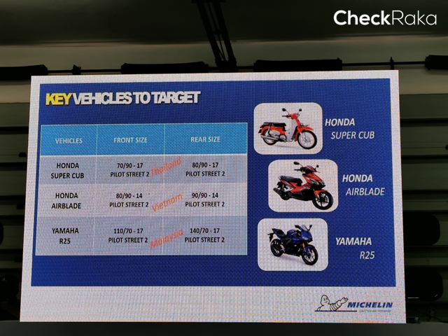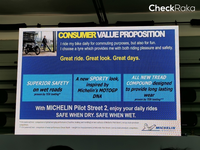 มาดูรายละเอียดสเปคของเจ้า Michelin Pilot Street 2 กันก่อนว่ามันมีดียังไง เริ่มด้วยการใช้พื้นฐานของ Pilot Street รุ่นเดิมที่ดีอยู่แล้วมาพัฒนาเพิ่มเติม และใช้เทคโนโลยีจากยางรถจักรยานยนต์ที่ใช้ในการแข่งขันรายการระดับโลกอย่าง MotoGP ที่มิชลินทุ่มเทวิจัยอย่างหนัก เพื่อให้ใช้งานกับสภาพถนนจริงในแถบประเทศเอเชียโดยเฉพาะประเทศไทย ดูจากรูปที่พรีเซนเทชั่นในสไลด์ได้ว่ารถมอเตอร์ไซค์น่าจะเป็นรุ่นที่ใช้ในไทยแยกสี่แยกที่คุ้นๆ ตา!