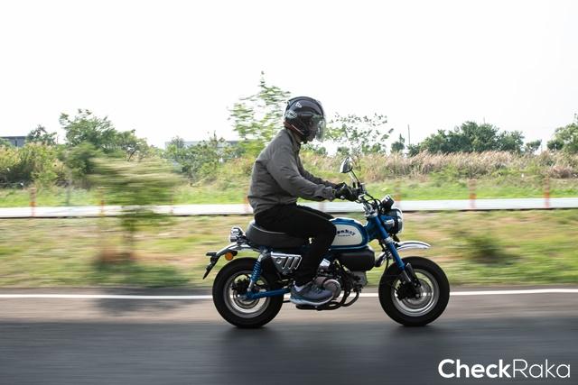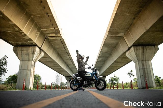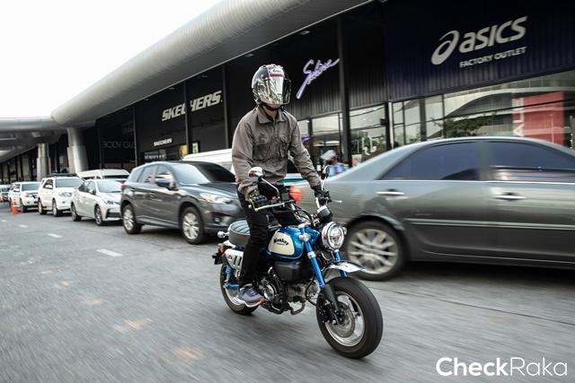 เมื่อถึงเวลาลองของจริงผู้เขียนก็ขี่ออกจากคับเฮ้าส์เอกมัยมุ่งหน้าถนนรามอินทราฝ่าการจราจรที่พลุกพล่านอากาศที่ร้อนแผดเผา ปลายทางอยู่ที่การไปหาที่ถ่ายรูปสนุกๆ และถนนโล่งๆ ได้ขี่แบบตามใจ ช่วงแรกที่เริ่มนั่งขี่รถนั้น ตำแหน่งต่างๆ ของ ฮอนด้า มังกี้ ถูกจัดมาให้ตามรูปแบบสไตล์เฉพาะตัว ซึ่งพบว่าเป็นท่านั่งที่ค่อนข้างสบายเกิดคาด เบาะนุ่มรับได้ตำแหน่งก้นได้กว้างพอกับทุกคน แฮนด์ที่ยกองศาขึ้นมาให้ความสบายในการขี่ยาวๆ น้ำหนักหน้ารถรู้สึกหนักมือไปหน่อยอาจเพราะยังไม่คุ้นชิน ตำแหน่งวางเท้าก็ยังโอเค แต่แอบระวังแนวท่อไอเสียที่ยกสูงข้างเบาะเหมือนรถกลุ่มสแครมเบลอร์ แม้มีแผ่นบังความร้อนก็ตามด้วยความที่เป็นรถเล็ก และระบายความร้อนด้วยอากาศ แต่โดยรวม ฮอนด้า มังกี้ นับเป็นมินิไบค์ที่มีท่านั่งแบบ Ergonomic ดีมาก