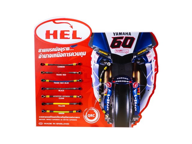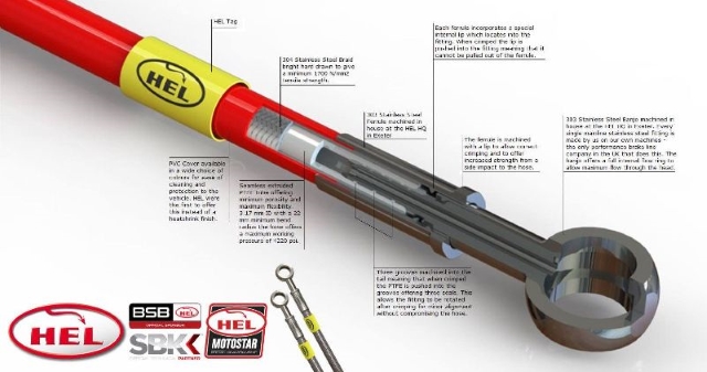 สายถัก HEL เป็นระบบสายเบรกที่ใช้มากที่สุดในการแข่ง Moto GP, WSBK และ BSB เพราะเป็นสายสแตนเลสถักที่ย้ำกับหัวข้อต่อสแตนเลส (ไม่ใช่อะลูมิเนียม) และใช้การย้ำด้วยเครื่องย้ำสายเฉพาะทาง จึงให้ความแม่นยำในการเบรกสูงสุดโดยมีอัตราการแตกหัก 0%