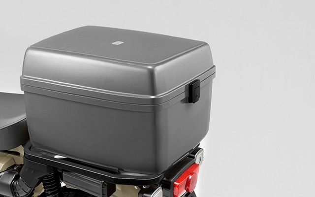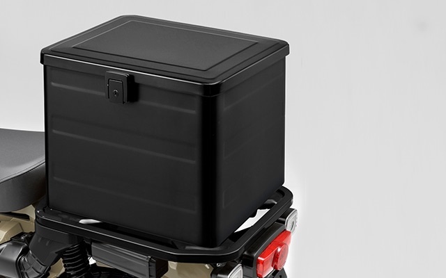 3. กล่องหลัง Luggage Box ทรงดูเหมือนถังมากกว่า แต่ชิ้นนี้เป็นงานโลหะ แข็งแรงกว่าพวกกล่องพลาสติก ไว้สำหรับสายลุยจริงๆ ตัวถังทำสีดำกึ่งเงามา วางไว้ด้านท้าย รับน้ำหนักได้ไม่เกิน 10 กก. พื้นที่จุของได้ 39 ลิตร ขนาด 401*323*305 มม. (ยาว*กว้าง*สูง) เลขพาร์ตไอเท็มนี้คือ 08L71-K88-J10ZA ราคา 9,900 เยน ใช้เวลาติดตั้งไม่เกิน 20 นาที แข็งแรงแบบนี้ด้านบนก็สามารถมัดกระเป๋าวางทับไว้ได้อีกถ้าเน้นไปทริป