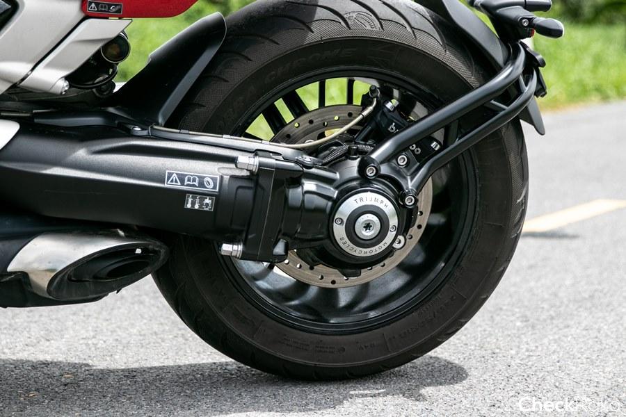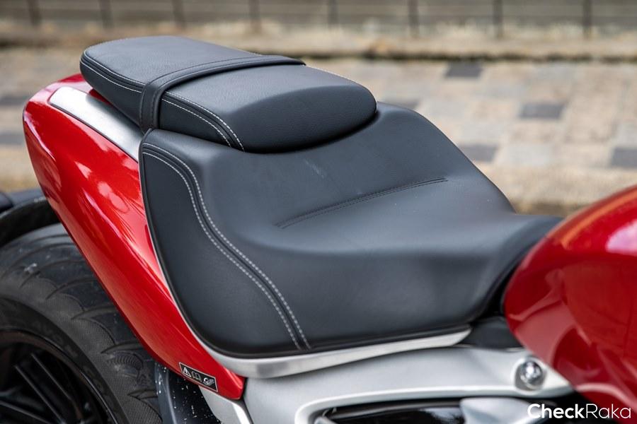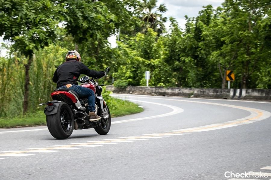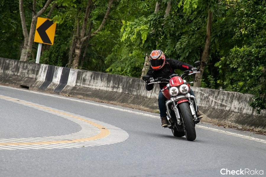 การขี่ด้วยความเร็วปานกลาง-สูง และการเปลี่ยนเลนไปมา ตัวรถห้สมดุลที่ดี ด้วยยางเอวอนสัญชาติอังกฤษ หน้ากว้าง 150/80 R17 หลัง 240/50 R16 ทำให้รู้สึกมั่นคงดีเหลือเกิน นอกจากนี้เบาะนั่งยังให้ความนุ่มสบายตลอดการขี่