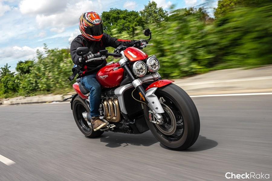 อย่างไรก็ตามในช่วงขี่บนถนนไฮเวย์เปิดโล่งตอนขากลับก็ได้โอกาสลองอัตราเร่งหลายครั้ง ยอมรับขุมพลังและระบบเกียร์ของร็อคเกต 3 อาร์ ตอบสนองได้อย่างยอดเยี่ยม สมูธไปกับการไต่ระดับความเร็วอย่างต่อเนื่อง เกียร์ที่ใช้งานได้กว้างอย่างช่วงหนึ่ง ผมใช้เกียร์ 4 กับความเร็วต่ำระดับ 60 กม./ชม. และเร่งขึ้นไปทันที เป็นจังหวะที่ต้องสู้กับแรงจี ความเร็วที่แหวกอากาศมาปะทะตัว เพราะไม่มีชิลด์หน้า และภาพรอบข้างที่เคลื่อนไหวอย่างรวดเร็ว สายตาเหลือบมองหน้าจอแสดงความเร็ว 183 กม./ชม. เริ่มกลัวใจตัวเองจึงต้องยก แม้จะไปได้อีก ! นับเป็นการทะยานความเร็วบนถนนแบบที่ไม่เคยสัมผัสมาก่อนจริงๆ เอาเป็นว่าเรื่องของสมรรถนะร็อคเกต 3 อาร์ คงไม่มีข้อสงสัยใดๆ ให้คาใจ มีแต่จะติดใจ การขี่ที่ผ่านมาทั้งหมดใช้โหมด Road และปรับค่าโช๊คหน้า-หลัง ไว้ตำแหน่งกึ่งกลางทั้งหมด ก่อนจบการทดสอบผมได้โอกาสทดสอบระบบเอบีเอสโดยไม่ได้ตั้งใจ เพราะฝนที่กระหน่ำลงมา แต่เลือกที่จะไปต่อ โดยปรับเป็นโหมด Rain สัมผัสได้ถึงการควบคุมแทร็คชันที่มากขึ้น และในจังหวะที่ผู้เขียนขี่ฝ่าฝนบนถนนเจิ่งนองไปด้วยน้ำ ได้เปิดคันเร่งเพื่อแซงรถยนต์ช้าด้านหน้าก่อนกลับเข้าเลน แต่รถด้านหน้าอีกคันกลับเบรกกระทันหัน ทำให้ต้องเบรกกระทันหันตาม จนเอบีเอสทำงาน และสามารถหยุดรถได้ทันท่วงทีด้วยระยะที่เหลือไว้ประมาณ 1 ซม. ก็แปลกใจพอสมควรที่ไม่ชน เพราะคิดคำนวนการน้ำหนักรถและพื้นผิวถนนแล้วไม่น่าเอาอยู่ แต่ก็หยุดได้พอดี นับเป็นความประทับใจในระบบเบรกอีกอย่าง สุดท้ายตัวเลขอัตราสิ้นเปลืองของเครื่องยนต์ 2,500 ซีซี 167 แรงม้า น้ำหนักตัว 291 กก. จากการขี่เป็นระยะทางรวมทั้งหมดกว่า 200 กม. ได้ 12.8 กม./ลิตร