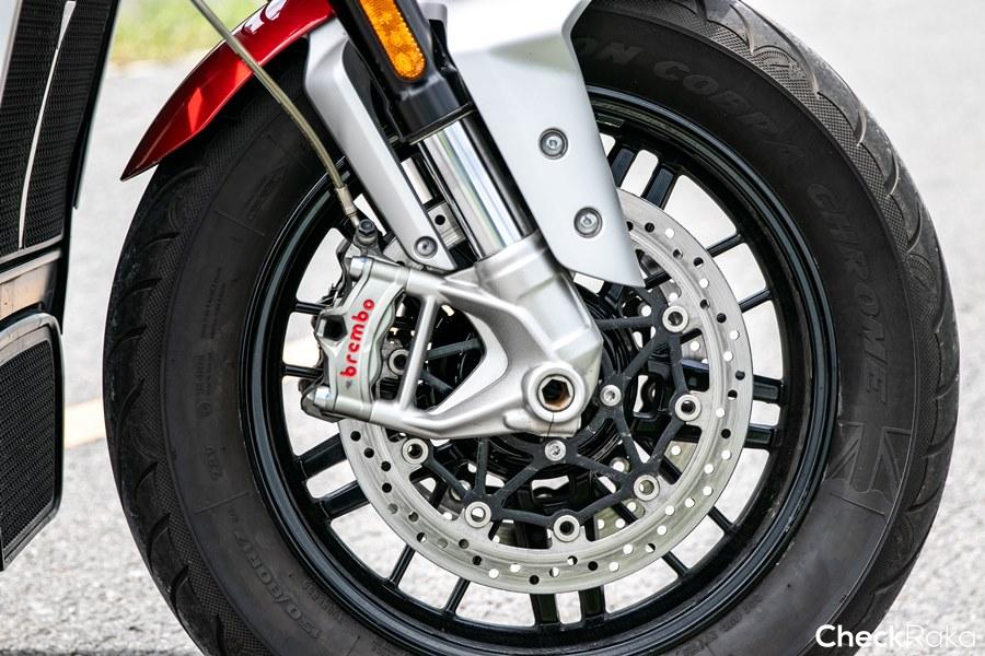 ส่วนระบบเบรกด้านหน้าใช้ดิสก์เบรก จานเบรกคู่ขนาด 320 มม. พร้อมด้วยคาลิปเปอร์โมโนบล็อค Brembo M4.30 Stylema 4 ลูกสูบ และระบบ Cornering ABS ด้านหลังใช้ดิสก์เบรก จานเบรกเดี่ยวขนาด 300 มม. พร้อมด้วยคาลิปเปอร์โมโนบล็อค Brembo M4.32 4 ลูกสูบ และระบบ Cornering ABS ให้ความมั่นใจเมื่อต้องเบรกในโค้ง