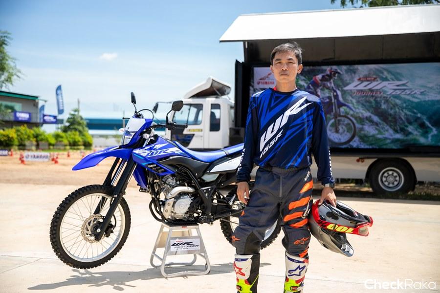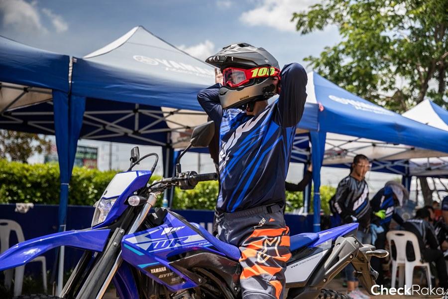 ทีมงาน MotorBikeGURU Thailand โดย เช็คราคา.คอม ร่วมเป็นส่วนหนึ่งของผู้เข้าทดสอบในครั้งนี้ โดยกำหนดเวลาทดสอบกันในช่วงเช้าแบ่งออกเป็นกลุ่มตามจำนวนสื่อที่เข้าร่วมขี่กันมากมาย ผู้เขียนอยู่ในกลุ่มสุดท้าย ทำให้มีโอกาสเดินเก็บภาพ ข้อมูลและสังเกตุการณ์ได้สะดวก พร้อมกับรับฟังการบรรยายไฮไลท์ของ All New WR155R ซึ่งติดตั้งเครื่องยนต์บล็อคเดียวกับรุ่น MT-15 และ YZF-R15 สูบเดี่ยว SOHC 4 วาล์ว 155 ซีซี พร้อมเทคโนโลยี Variable Value Actuation (VVA) ให้พลัง 16.5 แรงม้า ที่ 10,000 รอบต่อนาที แรงบิดสูงสุด 14.3 นิวตันเมตร ที่ 6,500 รอบต่อนาที ส่งกำลังผ่านเกียร์ 6 สปีด ตัวเครื่องยนต์ระบายความร้อนด้วยน้ำ ซึ่งหม้อนำมีการ์ดป้องกันแข็งแรงอย่างดีมาให้ ระบบกันสะเทือนทั้งหน้า-หลังใช้ของคายาบ้า ญี่ปุ่น ด้านหน้าขนาด 41 มม. หลังเป็นแบบโมโนปรับพรีโหลดได้ 5 ระดับ ฝาถังน้ำมันป้องกันการย้อนกลับ ถังน้ำมันจุ 8.1 ลิตร เคลมว่าวิ่งได้ไกลมากกว่า 300 กม. เบาะสูง 880 มม. ผู้เขียนสูง 171 ซม. ขึ้นไปนั่งช่วงล่างยุบลงมาพอให้ขาเหยียบพื้นได้สบาย น้ำหนักตัวรถ 134 กก. ยางหน้าขนาด 2.75-21 45p หลัง 4.10-18 59p ดิสก์เบรกหน้าขนาด 240 มม. หลังขนาด 220 มม.