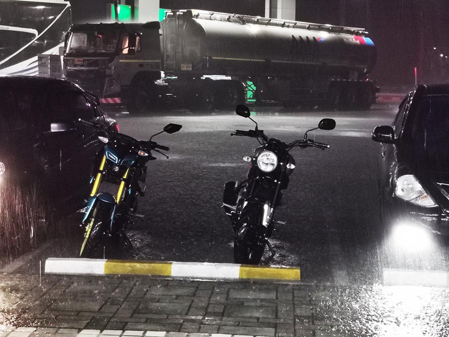ในช่วงขากลับจากลพบุรี ทันทีที่ขยับรถออกจากร้านฝนก็เทกระหน่ำแบบหนักหน่วง ทำให้ต้องชะลอการเดินทาง พอฝนซาลงจึงได้ออกเดินทางกันราวห้าโมงเย็นเพื่อมุ่งหน้ากลับเข้ากรุงเทพฯ งานนี้ต้องขี่ฝ่าความมืด ก็นับเป็นการพิสูจน์ระบบไฟส่องสว่างของรถทั้งสองรุ่นที่ช่วยให้การขี่ทางไกลยามค่ำคืนมั่นใจ ไม่ใช่แค่ความมืดที่เราต้องฝ่าฟัน ในช่วง อ.หนองแค จ.สระบุรี พายุฝนที่เทกระหน่ำมาสักพักเริ่มแรงจะพัดรถเซ และมองผ่านชิลด์ไม่เห็นทัศนวิสัยจึงต้องแวะจอดพักกันในปั๊มน้ำมัน รอจนฝนเบาลงจึงเดินทางขี่กันต่อ ทั้งรถและคนขี่ต่างเปียกทั่วทุกจุด แต่ก็พากันทะยานไปข้างหน้าอย่างมุ่งมั่น แม้คนขี่จะเริ่มล้าบ้าง แต่ด้วยมาตรฐานที่ดีของตัวรถยามาฮ่า ทำให้การเดินทางครั้งนี้สมบูรณ์แบบและจบลงแบบไร้ปัญหาและอุบัติเหตุใดๆ ผู้ขี่ทั้งสองคันถึงกรุงเทพฯ กันตอนสามทุ่ม พร้อมกับความรู้สึกเชื่อมั่นและประทับใจในรถทั้งสองรุ่นนี้จริงๆ