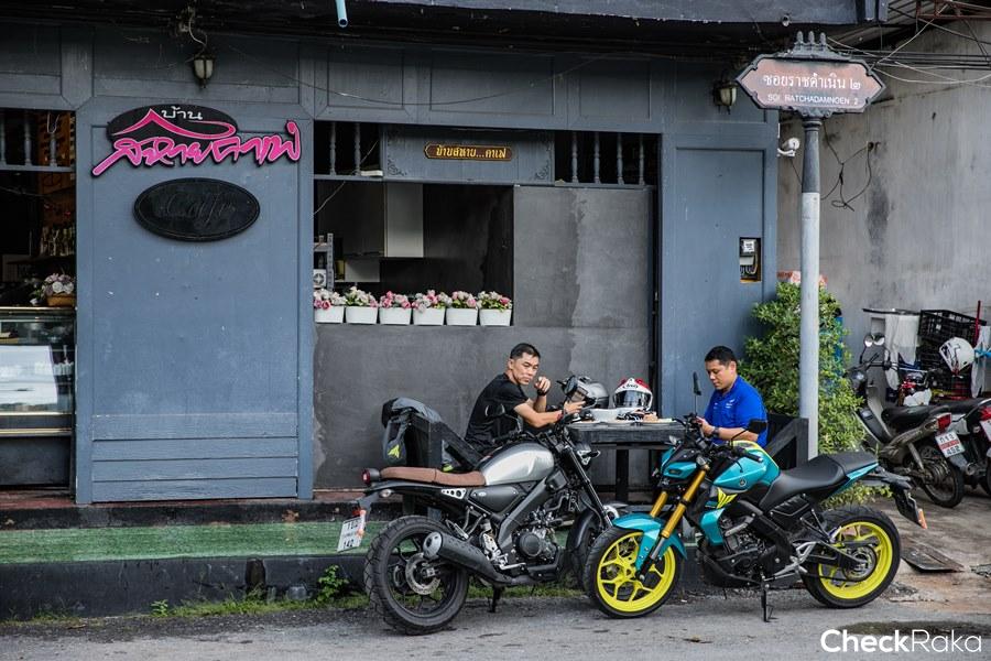 หลังจากเติมพลังด้วยกาแฟเลิศรส สนทนาถึงฟีลลิ่งการขี่ พอแยกความต่างเบื้องต้นระหว่างรถสองรุ่นนี้ได้ว่า ท่านั่งที่ขยับได้สะดวกกว่าต้องยกให้ XSR-155 ให้ความนุ่มนวลจากวัสดุเบาะและลุยถนนได้หลากหลายอย่างสบายใจ ด้วยยางแบบดูอัลเพอร์โพส การขี่ถนนต่างจังหวัด ด้วยเส้นทางสายรองทำให้เจอพื้นผิวถนนที่แตก เป็นลอน หลุม และซ่อมแซมบ่อย ในส่วนของ MT-15 ให้ซุ่มเสียงจากเครื่องยนต์ที่ดังเร้าใจ ตอบสนองคันเร่งได้กระฉับกระเฉงกว่า อย่างไรก็ตามคงต้องรอสรุปหลังสลับรถขี่ไปจนถึงร้านสหายคาเฟ่อีกครั้ง