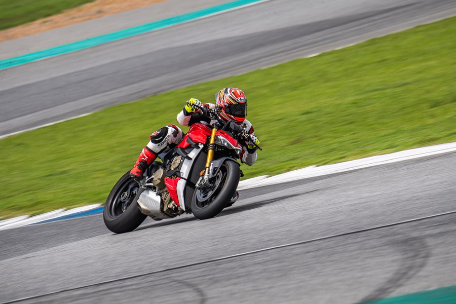 บิ๊กไบค์ตัวแรงพลัง 208 แรงม้า รูปทรงสไตล์ Naked แต่เท่ด้วยวิงก์เลท และรูปลักษณ์อันโดดเด่นน่าเกรงขาม เสมือนเป็นการนำ Panigale V4 มาถอดแฟริ่ง น้ำหนักตัวพร้อมขี่อยู่ 199 กิโลกรัม (เวอร์ชั่น S) ขับเคลื่อนด้วยเครื่องยนต์ Desmosedici Stradale 1,103 ซีซี พร้อมเทคโนโลยีอันล้ำสมัย ยางที่ใช้เป็นพีเรลลี่รุ่น Pirelli Diablo Rosso Corsa II ขนาดหน้า 120/70 ZR17 หลัง 200/60 ZR 17 ไม่เหมือนกับใน Panigale V4 ที่ใช้ Supercorsa SP ซึ่งจริงๆ คาแรคเตอร์การทำงานของยางแทบไม่ต่างกัน แต่ Corsa II ทำงานที่อุณหภูมิต่ำกว่าเพื่อการขี่บนถนนส่วนหนึ่ง ในส่วนของการทดสอบขี่ ด้วยท่านั่งที่สบายแบบ Upright ทำให้รู้สึกผ่อนคลายตั้งแต่แรก แม้เบาะสูง 845 มม. CG อาจไม่ได้ต่ำมาก แต่ทำให้พลิกเข้าโค้งง่ายและสนุก ทันทีที่ไหลรถพ้นจากเขตสปีดลิมิต พร้อมเปิดคันเร่งแรงบิดขนาด 123 นิวตันเมตร ที่ 11,500 รอบต่อนาที ก็พารถทะยานพุ่งไปข้างหน้าอย่างรวดเร็ว แรงลมที่ปะทะตัวเข้ามาทำให้สัมผัสได้ถึงขุมพลังอันเร้าใจ อัตราเร่งและระบบช่วยเหลือตอนออกจากโค้งที่ปรับไว้ในโหมด Race ทำงานผสานกันได้อย่างดี ให้ความมั่นใจมากขึ้นในทุกรอบการขี่ ส่วนเกียร์ควิกชิฟท์ต่อกันได้เนียนแทบไม่รู้สึก ในช่วงทางตรงรถให้ความมั่นคง ชอบเพราะเป็นเน็กเก็ตไบค์ระดับหัวแถวที่มีรูปลักษณ์เฉพาะตัวและสวยงามที่สุด นอกจากนี้ยังขี่ในสนามสนุก ขี่ถนนก็น่าจะเป็นความหล่อที่สะกดทุกสายตา ให้อารมณ์เหมือนมองลัมบอร์กีนีบนถนน ตอบแทนราคาที่จ่ายตัวรถระดับนี้ !