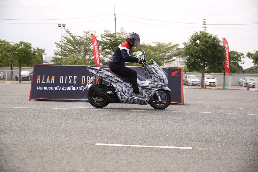 การขี่ทดสอบในศูนย์ฝึกขับขี่ปลอดภัยฮอนด้า เลย์เอ้าท์การขี่ได้วางไว้แบบเสมือนเต็มรอบ มีจุดหยุดเดียวเพื่อเลือกเข้าเส้นทางทดสอบเบรกABS กับระบบแทรกชันคอนโทรล ทำให้ได้การขี่หลากหลายรูปแบบและครอบคลุมการพิสูจน์สมรรถนะตัวรถอย่างเต็มที่ เช่น ทางตรงยาว โค้งความเร็วต่ำ-กลาง ทางคดเคี้ยว เนินขึ้น-ลงสะพาน ช่วงเวลา 30 นาที ที่ผู้เขียนได้ขี่ครบทั้ง 2 รุ่นพอสรุปเบื้องต้นได้ว่า PCX 160 เจนเนอเรชั่นใหม่ ใช้เครื่องยนต์สูบเดียว ขนาดความจุ 156 ซีซี SOHC ระบายความร้อยด้วยน้ำ พร้อมเทคโนโลยี PGM-Fi มีอัตราส่วนการอัดที่ 12:1 ให้กำลังสูงสุด 15.8 PS ที่ 8,500 รอบต่อนาที แรงบิดสูงสุด 15 นิวตันเมตร ที่ 6,500 รอบต่อนาที มากกว่า PCX 150 ปัจจุบันอยู่ 1.1 แรงม้า กับ 1.8 นิวตันเมตร ระบบเบรกดิสก์หน้า-หลัง และ ABS ที่ล้อหน้า พร้อมระบบแทร็คชันคอนโทรล Honda Selectable Torque Control (HSTC) ให้ความสนุก คล่องตัวในการขี่อย่างโดดเด่น กำลังที่ตอบสนองฉับไวและต่อเนื่องทุกครั้งที่เปิดคันเร่งหรือจังหวะยกชะลอและเร่งก็ทำได้ไหลลื่น การพลิกเข้าออกโค้งทำได้อย่างดั่งใจไปตามสั่ง ยางและระบบกันสะเทือนทำหน้าที่ผสานกันได้อย่างดี แม้โยนเข้าโค้งหรือพลิกไปมาระหว่างโค้งแคบ ตัวรถก็ตอบสนองไปในทิศทางที่ต้องการได้อย่างแม่นยำ และไม่ออกอาการใดๆ ให้กังวล ยิ่งขี่มากรอบยิ่งมั่นใจและสนุกไปกับการควบคุม ในช่วงทดลองระบบเบรก ABS บนพื้นผิวมัน จากจุดออกตัวแบบหยุดนิ่ง เร่งไปราว 20 เมตร แล้วกดก้านเบรกเต็มที่ตัวรถชะลอหยุดอย่างรวดเร็วพร้อมการเสียงทำงานของระบบ ABS น้ำหนักการกดนับว่าไม่แข็งตึงมือเหมือนรุ่นเก่า ฟิลิ่งการตอบสนองนับว่าน่าพอใจ ส่วนด้านระบบแทร็คชัน คอนโทรล จากจุดหยุดนิ่งแล้วเร่งออกตัวบนพื้นที่โรยด้วยดิน-ทราย ทันทีที่ล้อเริ่มมีอาการสลิปเครื่องยนต์ก็ถูกตัดการทำงานอย่างรวดเร็วเพื่อไม่ให้เกิดอาการท้ายปัด นับเป็นระบบความปลอดภัยที่จำเป็นสำหรับการขี่ในชีวิตประจำวันจริงๆ นอกจากนี้ยังได้ลองเบรกหนักให้ล้อล็อคบนพื้นผิวถนนปกติ โดยเบรกจากความเร็วประมาณ 60 กม./ชม. ให้รถหยุดนิ่งปรากฎว่าด้านหน้าที่มีเบรก ABS ทำงานได้ตามปกติแต่ต้องแบกรับน้ำหนักที่โยนมาจากด้านหลังเพราะเบรกหลังทำงานจนล้อล็อค แต่ก็กดจนอยู่ในระยะการเบรกที่ยอมรับได้ และรถไม่เสียอาการ สรุป PCX 160 ใหม่ เป็นสกู๊ตเตอร์ที่ตอบโจทย์การใช้งานในชีวิตประจำวันโดยเฉพาะในเมืองสำหรับคนกลุ่มใหญ่ได้อย่างครบถ้วน ถ้าเน้นกลุ่มที่เน้นสมรรถนะการขี่แบบสปอร์ตมากขึ้นก็สามารถไปอัพเกรดพาร์ตเฟอฟอร์มานซ์ที่ตอบสนองได้มากขึ้นภายหลัง