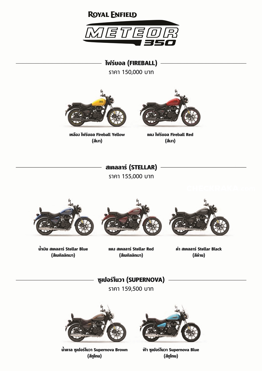 โรยัล เอ็นฟีลด์ เมทธีออร์ 350 รถมอเตอร์ไซค์ครุซเซอร์ 80 สไตล์ มาพร้อม 3 รุ่น เริ่มต้น Fireball แฮนด์ โลโก้สติ๊กเกอร์ ท่อสีดำขอบล้อสีเดียวกับรถ ราคา 150,000 บาท มีให้เลือก 2 สีคือ Fireball RED และ Fireball Yellow สำหรับรุ่น Stellar 155,000 บาท เพิ่มชิ้นส่วนโครเมี่ยม เช่น แฮนด์ ท่อ เบาะสีน้ำตาล พิงหลังและโลโก้ที่หนาขึ้น มี 3 สี คือ Stellar Black, Blue และ RED และ Supernova 159,500 บาท มี 2 สีทูโทน Brown และ Blue เพิ่มชิวหน้า พิงหลังและสีแบบทูโทน