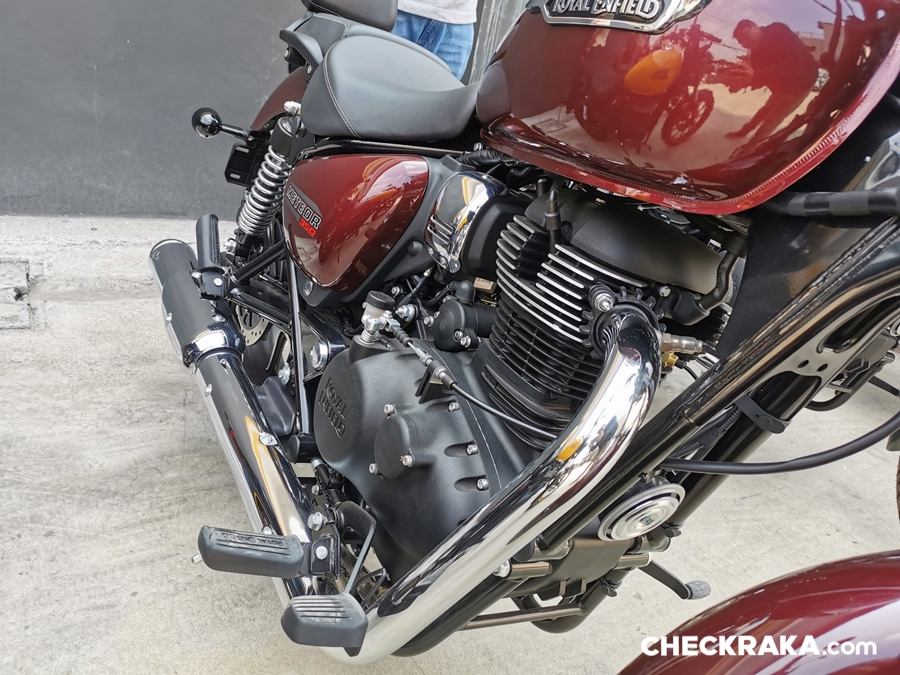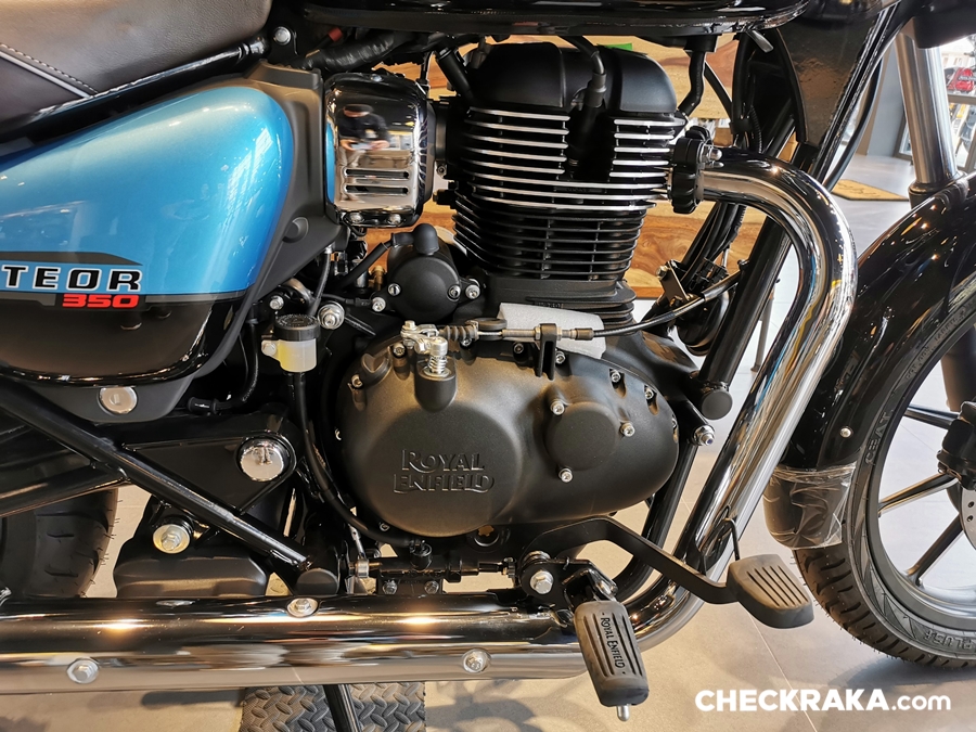 Royal enfield Meteor 350 ขุมพลังเครื่องยนต์แบบใหม่ล่าสุด 1 สูบ 4 จังหวะ ระบายความร้อนด้วยอากาศ ขนาด 349 ซีซี เครื่อง SOHC ที่มีช่วงชักยาว 72 มม. X 85.8 มม. (Long Stroke) กำลังอัด 9.5: 1 กำลังสูงสุด 20.2 แรงม้า (BHP) ที่ 6,100 รอบต่อนาที แรงบิดสูงสุด 27 นิวตันเมตร ที่ 4,000 รอบต่อนาที เกียร์ธรรมดา 5 สปีด ใช้น้ำมันเครื่อง SAE 15 W 50 API, SL grade, JASO MA 2 Semi Synthetic ที่ถูกออกแบบพิเศษเพื่อให้พละกำลังที่ต่อเนื่องและราบลื่น ให้แรงบิดที่พอเพียงในทุกช่วงของรอบเครื่องยนต์ หัวฉีดควบคุมด้วยระบบไฟฟ้า (EFI)