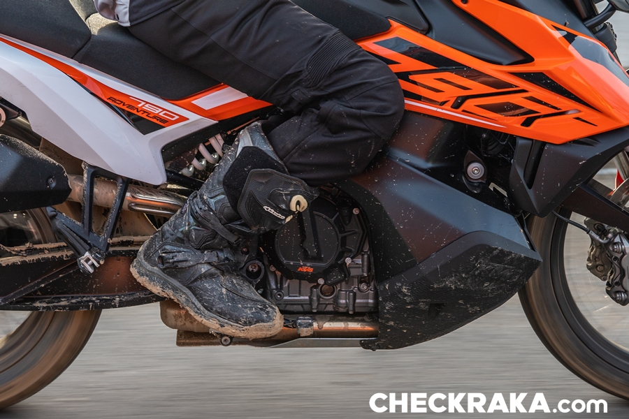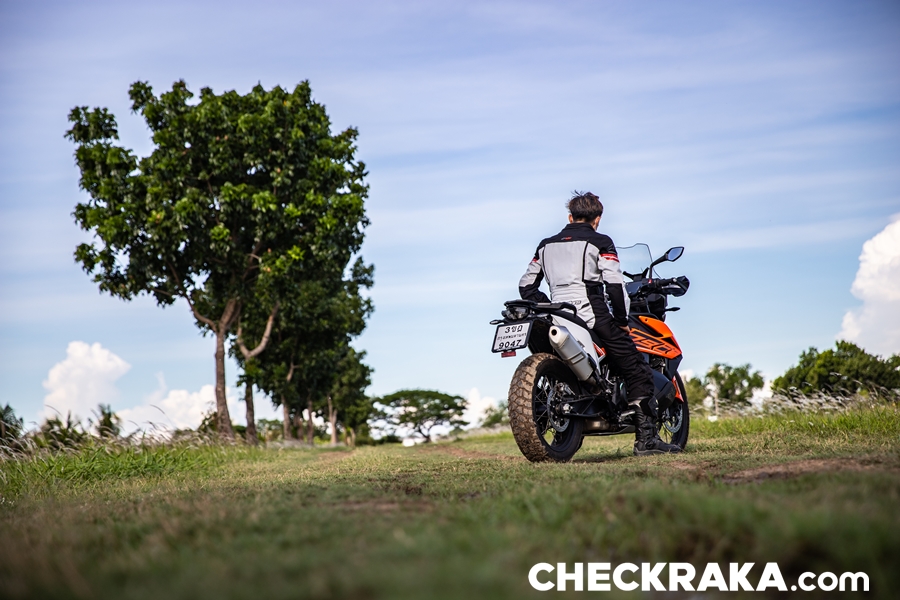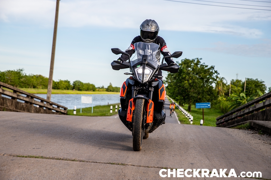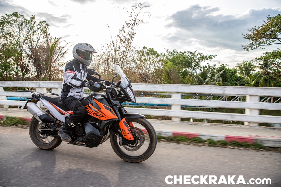 ผู้เขียนรับรถวันแรกจาก บริษัท วรูม จำกัด ผู้นำเข้าและผู้จัดจำหน่ายรถจักรยานยนต์แบรนด์ KTM ซอยลาดพร้าว 122 ตั้งใจขี่ทดสอบเต็มวัน ครั้งแรกที่ได้นั่งคร่อมตัวรถและขยับรถไปมาก็รู้สึกได้ถึงความเบาของตัวรถที่เกินคาดในคลาส 800 ซีซี อีกทั้งตำแหน่งเบาะนั่งยังสูงไม่มากเข้าใจว่าน่าจะปรับเป็น 830 มม. เพราะจากที่ผู้เขียนสูง 171 ซม. บวกรองเท้าอีกราว 3 ซม. แตะพื้นได้ครึ่งเท้า ก็ช่วยให้มั่นใจตอนขี่ฝ่ารถติดในเมืองมากขึ้น ช่วงแรกจากถนนลาดพร้าวมาถึงถนนแจ้งวัฒนะ ที่ต้องเลาะเลี้ยวผ่านช่องระหว่างรถยนต์ที่โดนบีบจากการทำแนวรางรถไฟฟ้า นอกจากนี้พื้นผิวถนนที่เสียหายหลายจุดก็ต้องระวัง อย่างไรก็ตาม 790 Adventure คันนี้ทำได้ดีเกินคาด สมดุลของรถดีทำให้จังหวะการเร่งชะลอง่าย อีกทั้งแรงบิดที่มาไวแต่ก็ช่วยให้การทะยานไปยังพื้นที่ว่างเป็นไปได้ดั่งใจคิด ตอบสนองได้ทันที ระบบช่วงล่าง WP ของแบรนด์นี้ขึ้นชื่อว่ายอดเยี่ยมการลุยทางขรุขระบนถนนในเมือง (ออนโร้ดที่เป็นออฟโร้ด) ทำได้อย่างมั่นใจ ผู้เขียนใช้เวลาไม่นานก็คุ้นกับน้ำหนักคันเร่ง เกียร์ และเบรก จนขี่มาถึงถนนแจ้งวัฒนะก็แวะเติมน้ำมัน จริงๆ ตัวรถนับว่าไม่มีอะไรซับซ้อนมากมาย การใชังานทั่วไปง่าย โหมดการขี่ตั้งไว้แบบ Street และ ABS เป็น Road ตั้งใจวันแรกขี่ออนโร้ดทางไกล (ช่วงต้นเดือน ก.ค. 2564) เพื่อสัมผัสการเป็นแอดเวนเจอร์ไบค์ที่เน้นทางดำ