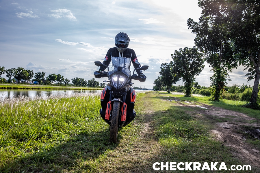 ผู้เขียนเดินทางจากแจ้งวัฒนะสู่เขตจังหวัดนนทบุรีแวะบันทึกภาพตามเส้นทางแบบคนเดียว ไม่มีช่างภาพติดตาม จากนนทบุรีมุ่งสู่อำเภอลาดบัวหลวง ต่อด้วย จังหวัดปทุมธานี จังหวัดอยุธยา ยิงยาวไปอำเภอสองพี่น้อง จังหวัดสุพรรณบุรี กลับมาผ่านอำเภอบางเลน จังหวัดนครปฐม ทั้งหมด 5 จังหวัดภายในครึ่งวัน ระยะทางเกือบ 250 กม. ไม่เยอะมากเพราะเป็นแนวจังหวัดที่คาบเกี่ยวกันหมด ความเร็วเดินทางก็ 80-120 กม/ชม. ค่าน้ำมันเฉลี่ยบนหน้าจอบอกไว้ 4.1 ลิตร/100กม. ความรู้สึกคือ ขี่ได้ยาวๆ ไม่เมื่อย เป็นรถที่ขี่แล้วไม่เครียด ออกทริปคนเดียวก็สะดวก เพราะน้ำหนักเบา ไม่ต้องกังวลเรื่องจุดจอดหรือการควบคุมเหมือนรถหนักระดับ 200 กก. ขึ้นไป ถ้าใครถอยรุ่นนี้นำไปติดตั้งแร็คและถังหลังหรือข้างเพิ่มก็พร้อมเป็นรถท่องเที่ยวได้ทันที สำหรับการขี่ทางไกลนอกจากความสบายแล้ว ยังได้ลองอัตราเร่ง แซง ซึ่งให้ความประทับใจไม่น้อยด้วยแรงบิดที่ยอดเยี่ยมนี่คือ บิ๊กไบค์แอดเวนเจอร์ ที่ไว้ใจได้ในการเดินทางจริงๆ รวมทั้งการใช้เบรกชะลอจากความเร็วสูงก็ให้ความรู้สึกตอบกลับที่ดี จบวันผู้เขียนก็ล้าก็เพราะผจญอากาศร้อนสะสมตลอดบ่ายมากกว่าการขี่