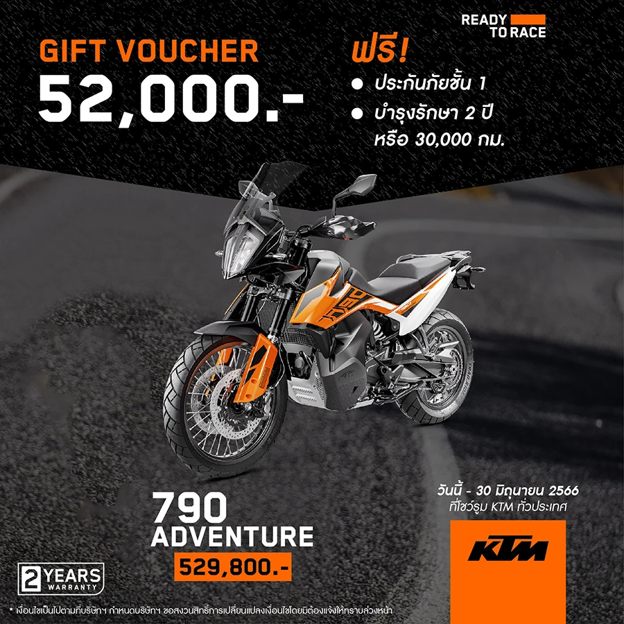 สำหรับใครที่สนใจอยากได้ KTM 790 Adventure ตอนนี้ KTM เขาก็มีโปรโมชันสุดพิเศษ KTM Ready to Care ฟรี! ประกันภัยชั้น 1 Warranty 2 ปี หรือ 30,000 กม. ตั้งแต่วันนี้ไปจนถึง 30 มิถุนายน 2566 ที่โชว์รูม KTM ทั่วประเทศไทย