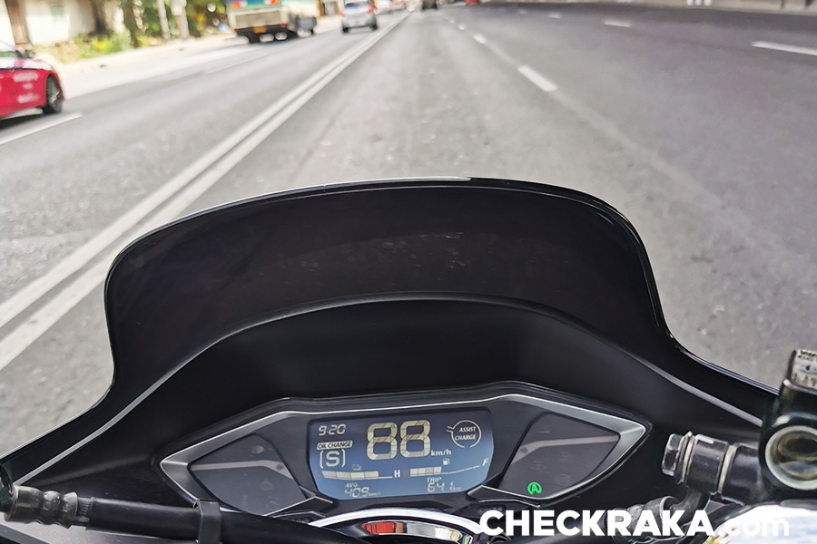 การขี่บนถนนเปิดโล่งอย่างเส้นวิภาวดีฯ มุ่งหน้าดอนเมือง ความเร็วยืนพื้นที่ขี่แล้วสบายใจก็อยู่ราว 90-100 กม./ชม. ถามว่าแช่ที่ความเร็ว 110 ขึ้นไปก็ได้อยู่ แต่ด้วยสภาพถนน พื้นผิวที่เป็นลอน ตัวรถขช่วงล่างเดิม ถ้าอัพเกรดช่วงล่างเพิ่มก็จะทำให้ขี่ได้สบายและมั่นใจมากขึ้น จุดประสงค์ของการใช้งานรุ่น PCX160 e:HEV คือ เป็นสกู๊ตเตอร์สำหรับเดินทางในชีวิตประจำวัน และมีความทันสมัย สำหรับผู้เขียนคิดว่าตอบโจทย์ได้อย่างครบถ้วน แม้พื้นที่ใต้เบาะโดนแบตเตอรี่แบ่งไปบางส่วนแต่พอใช้งานจริงก็ยังใส่ของส่วนตัวได้อย่างเหลือเฟือ